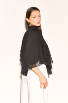 Elevate your style with the ALMA Black High Neck Cape Waterfall Top. This semi-sheer black cape top drapes effortlessly like a waterfall, adding a mysterious and playful twist to any outfit. It combines elegance and edge, making your look both bold and classy.