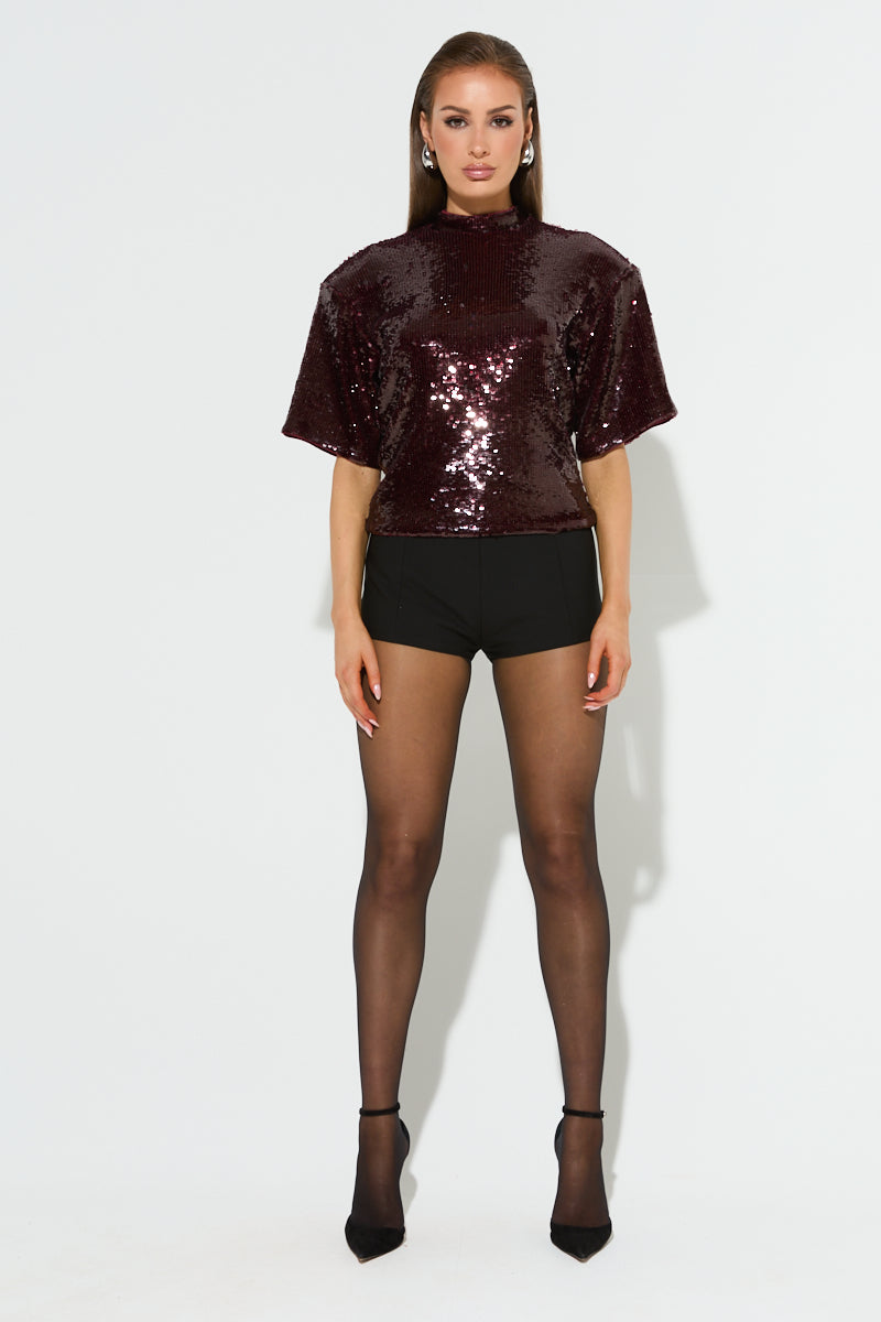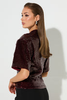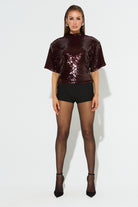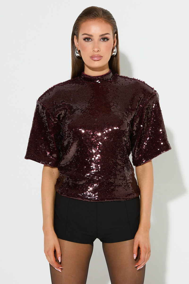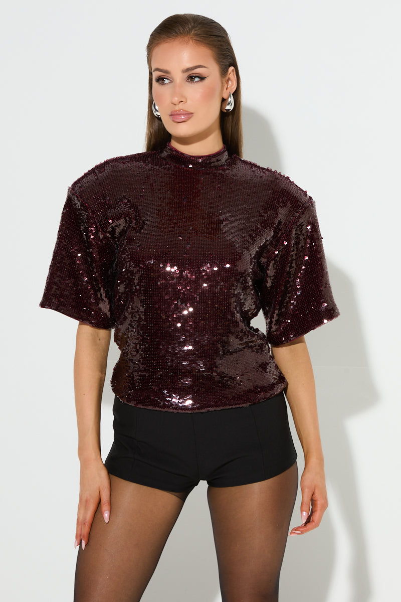 Introducing our ADA Burgundy Sequin Shoulder Pad T-Shirt, the perfect statement piece for your next party season look! With its eye-catching sequin design and elevated shoulder pads, this t-shirt will dress up any outfit.