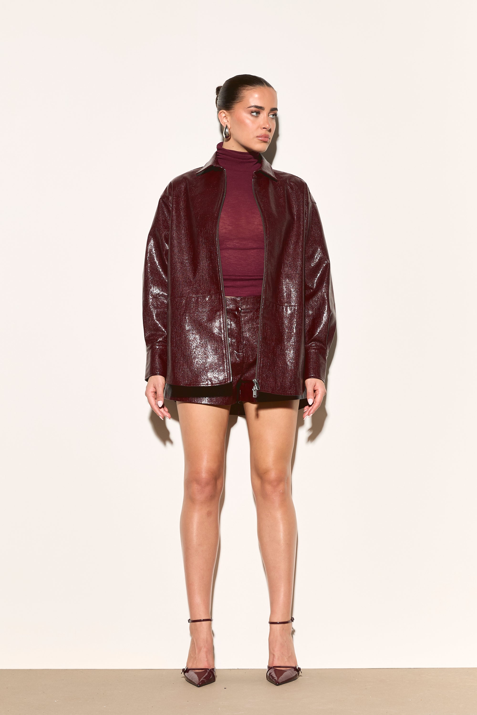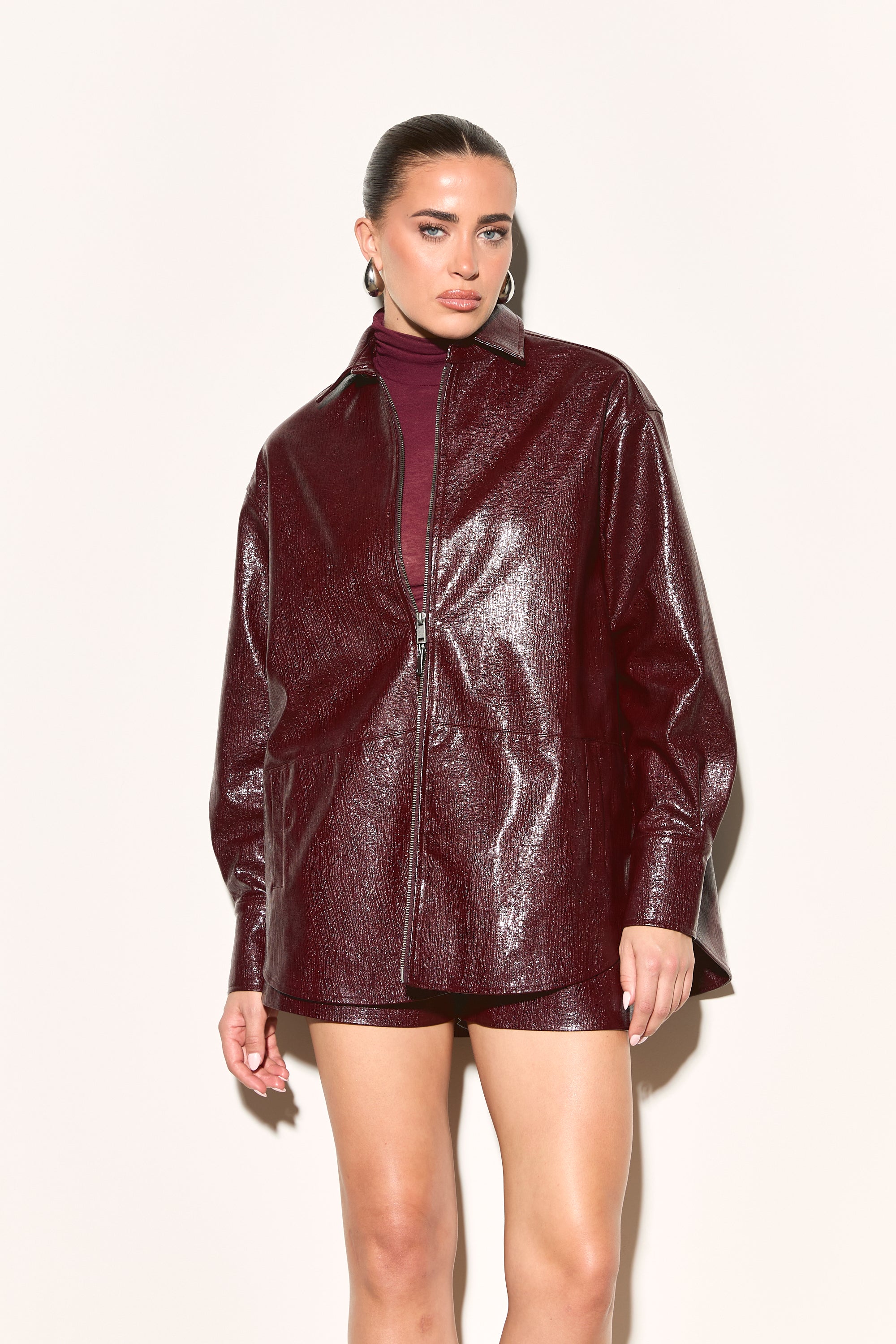 Make a statement with the ATHENA Burgundy Vinyl Oversized Zip Front Shirt. Its edgy vinyl shine and relaxed oversized fit let you stand out, whether worn on its own or paired with our HALLIE Burgundy Vinyl Shorts for a cool, casual vibe.