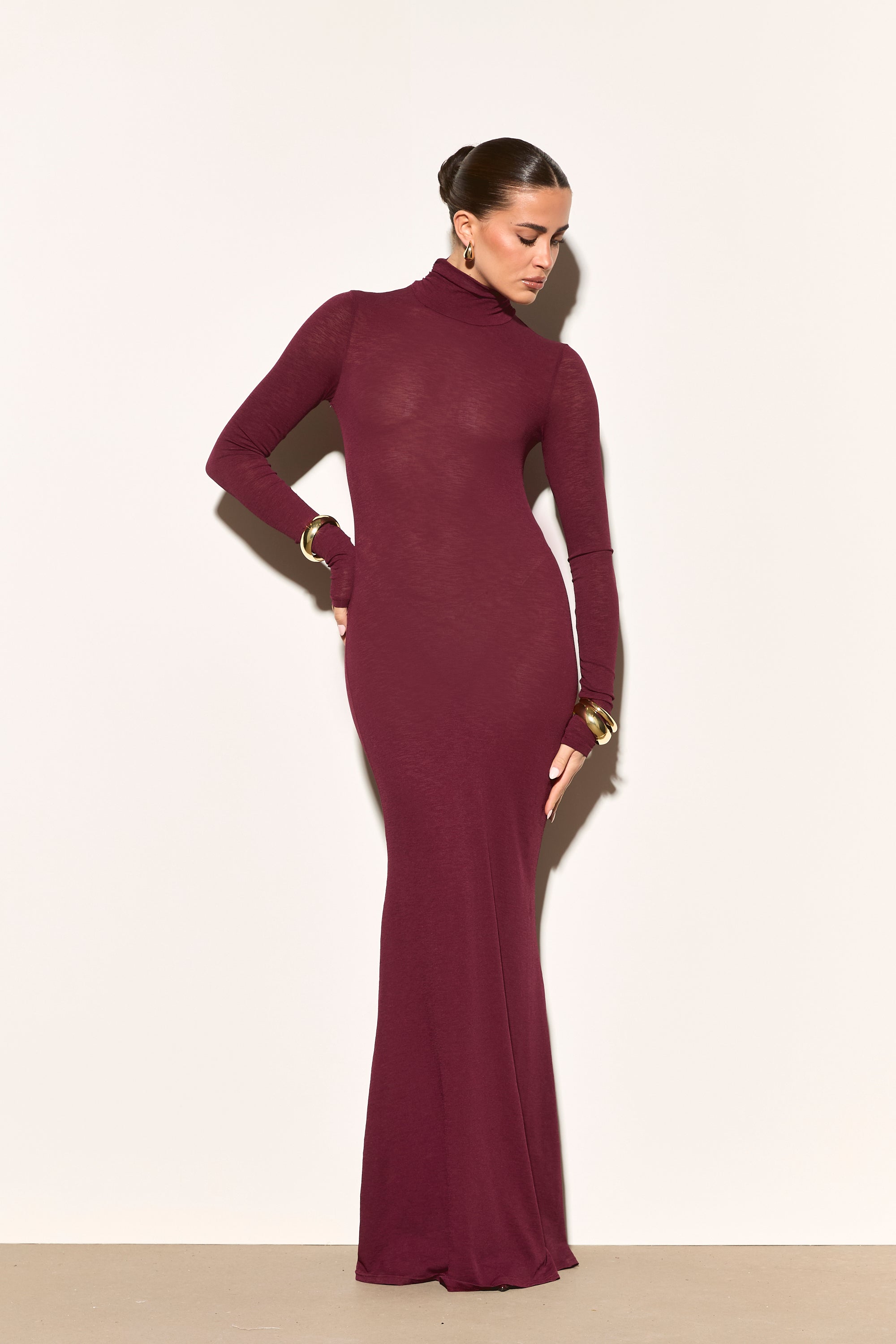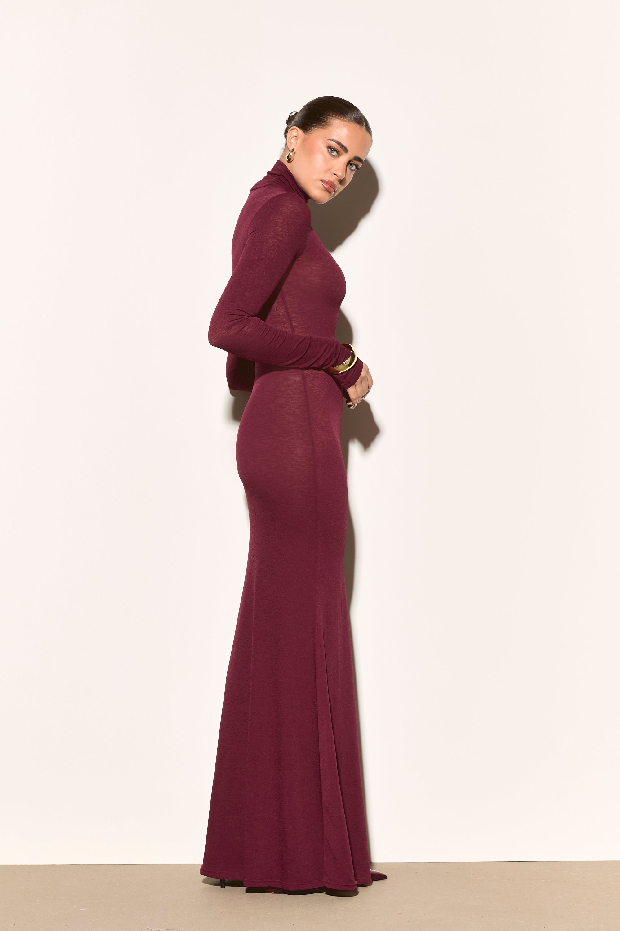 Slip into the GISELE Burgundy Fine Knit Maxi Dress for a sleek silhouette that hugs your curves just right. This close-fit maxi dress effortlessly combines elegance with a hint of charm, making it perfect for day or night.