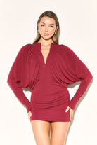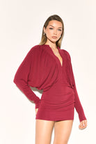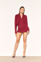 Step into the MARISA Burgundy Draped Sleeve Zip Front Dress for a night of effortless style and comfort. Its stretchy fabric moves with you stay comfy and look fabulous all evening long!