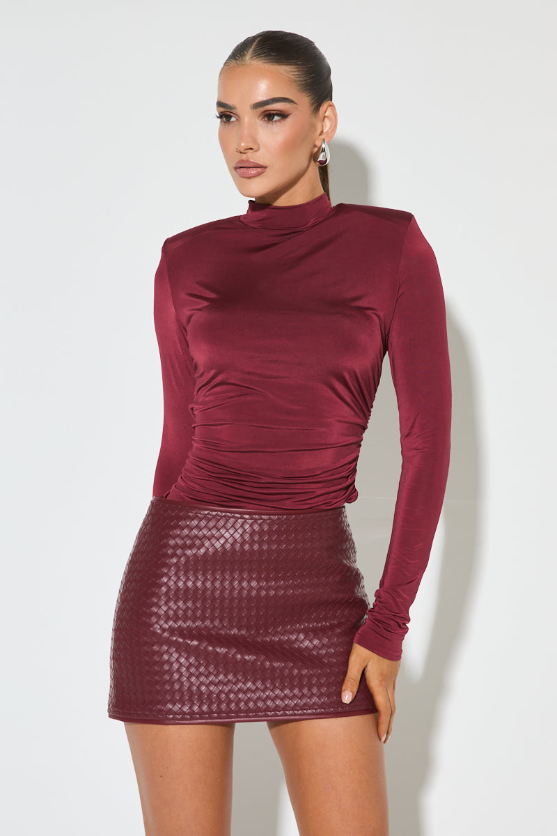 Introducing the VIVIANA Burgundy PU Woven Mini Skirt, a must-have for your A/W wardrobe. Made with high-quality PU leather, this skirt is a durable and fashionable addition to any outfit.