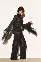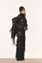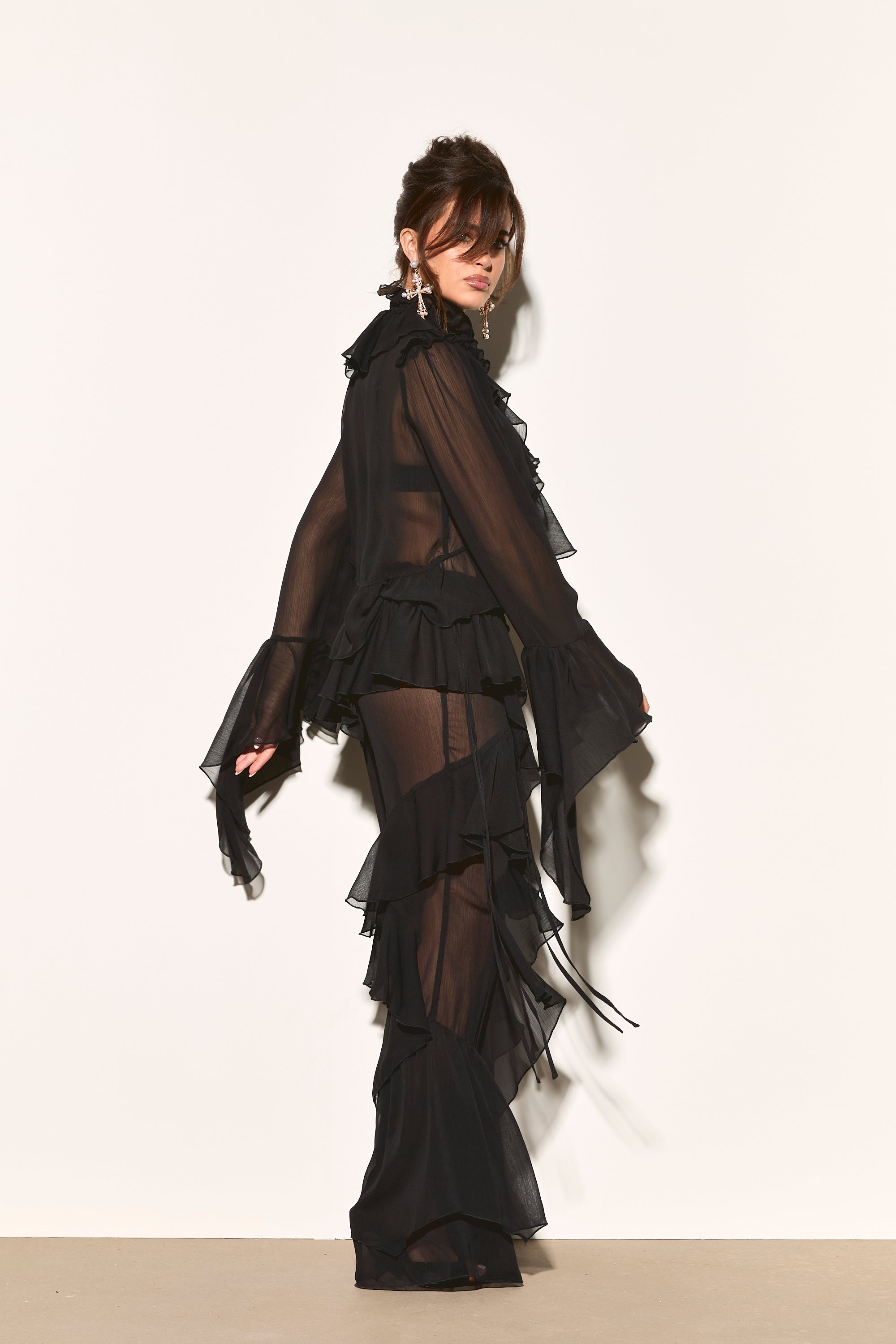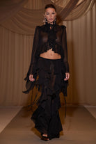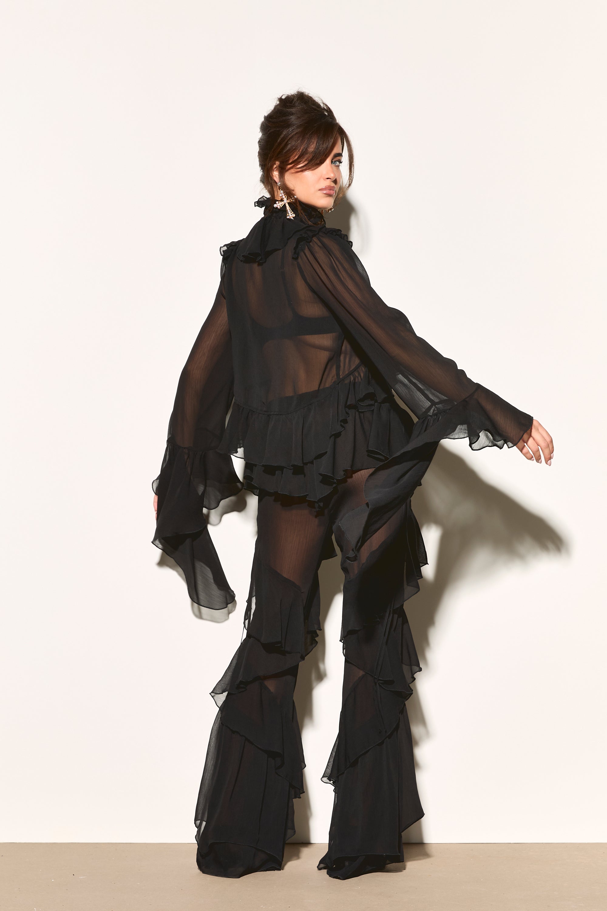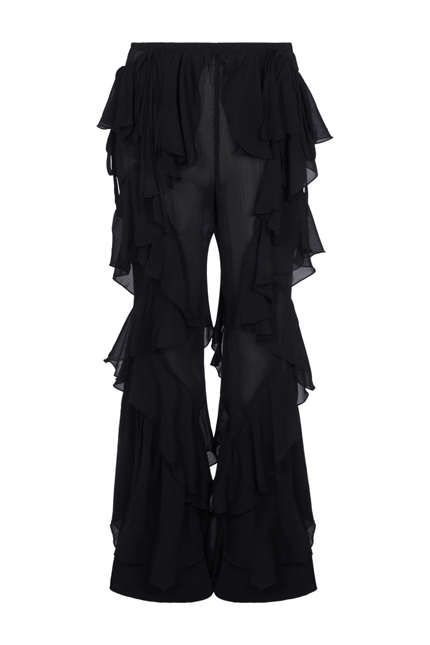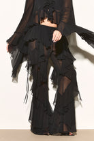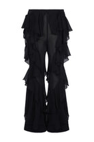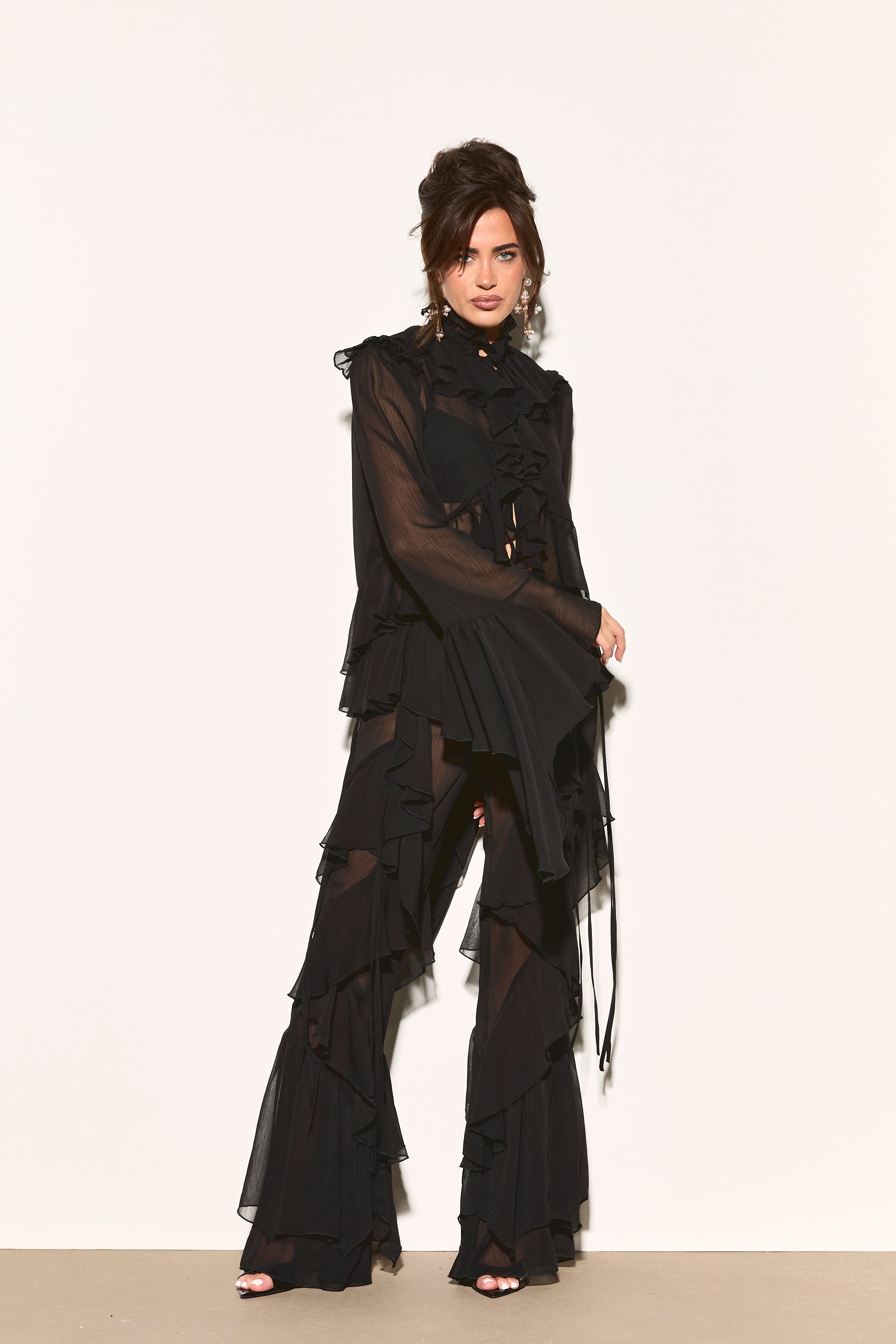 She's back for Autumn/Winter! Re-introducing the CELIA Cream Ruffle Flared Trousers - the perfect blend of boho and sophistication. Made of light chiffon fabric, the flattering ruffled design adds a touch of elegance to these trousers.