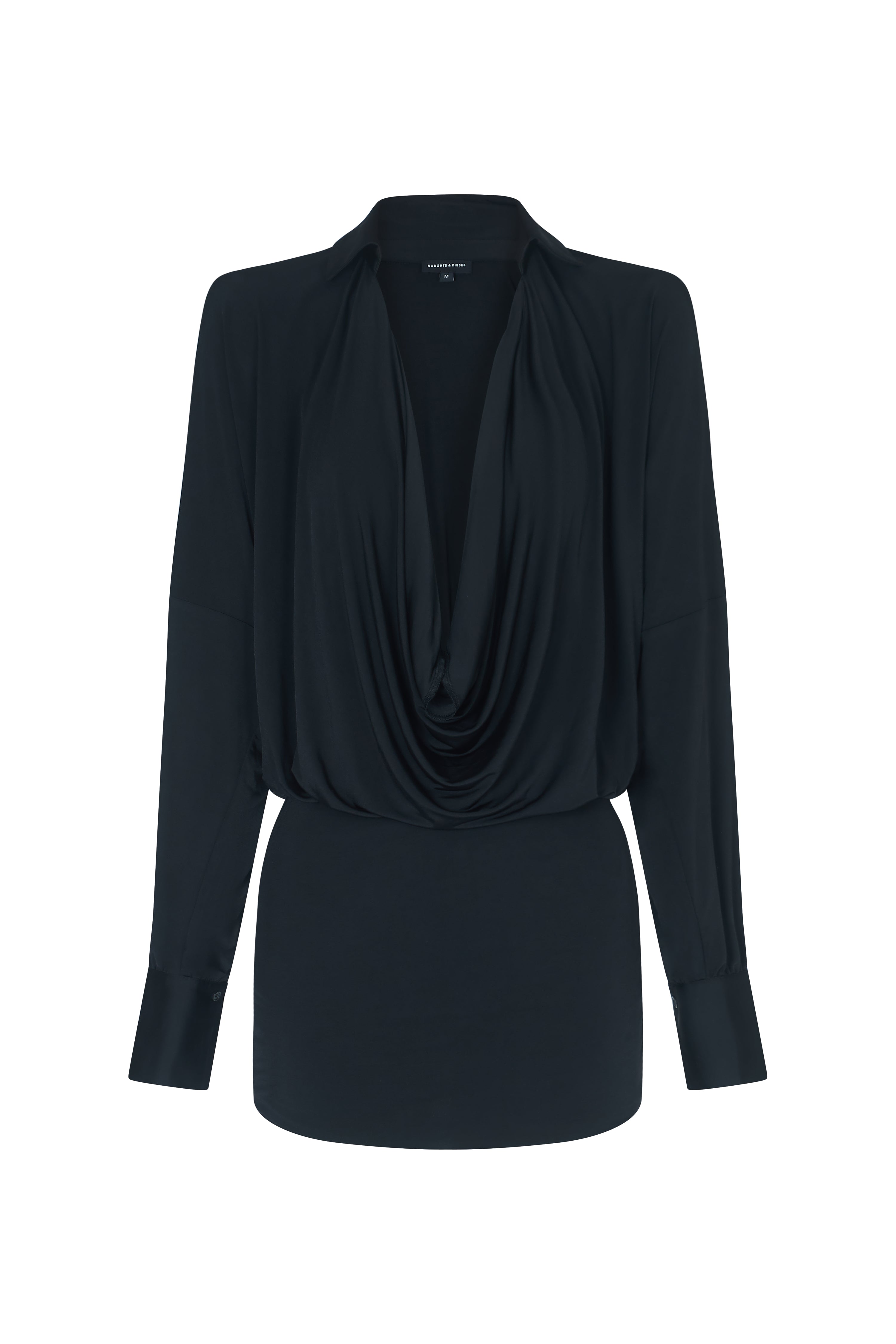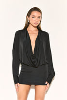 Turn heads effortlessly in the ISSY Black Cowl Neck Dress. This stretchy little black dress features a sexy draped front that flatters your curves while offering comfort. Perfect for nights out or special occasions!