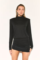 Slip into the MELIA Black Shoulder Pad Dress for a playful twist on a classic little black dress. With its stretchy fabric and bold shoulder pads, it hugs your curves while adding a confident, stylish edge.