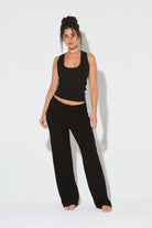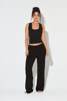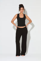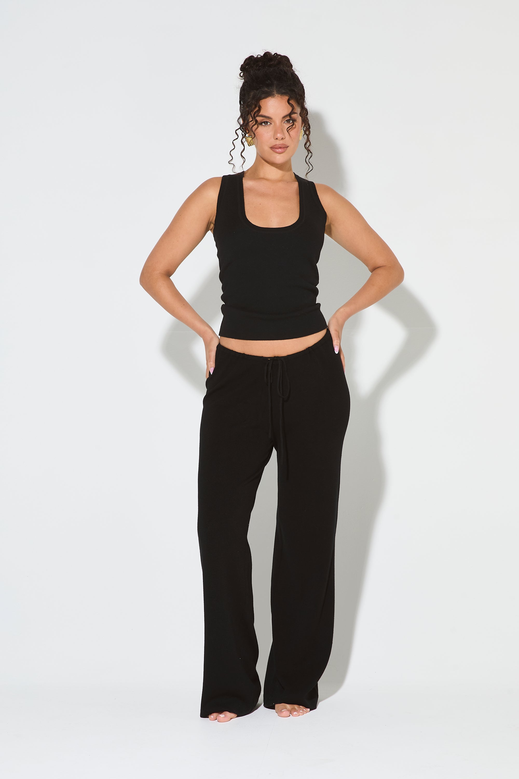 Our KIKKI Black Knit Trousers are the perfect mix of comfort and style. Made from a soft knit fabric, they are versatile for every season, making them a year-round staple in your wardrobe.