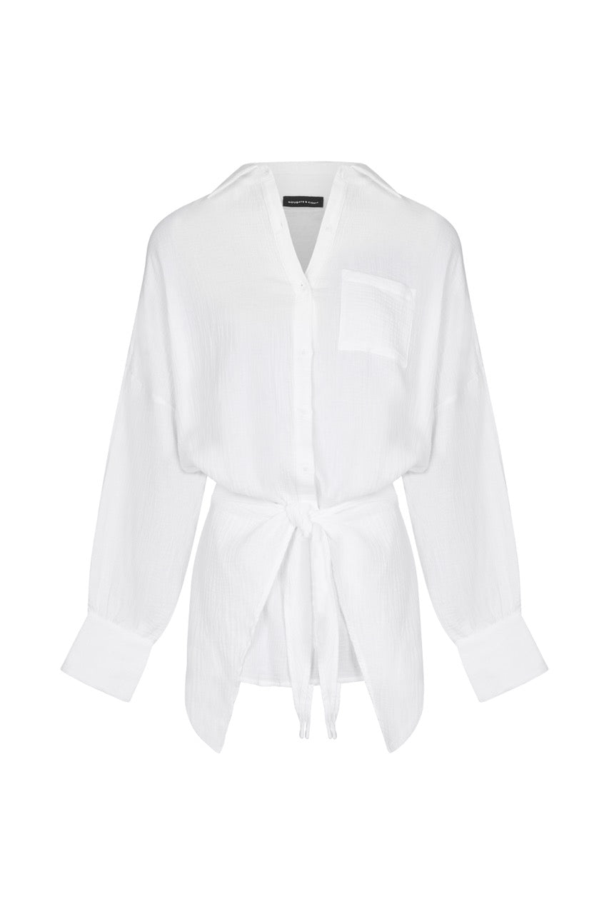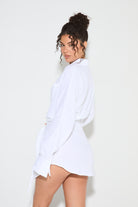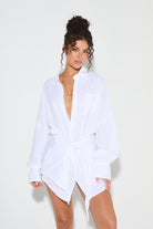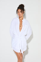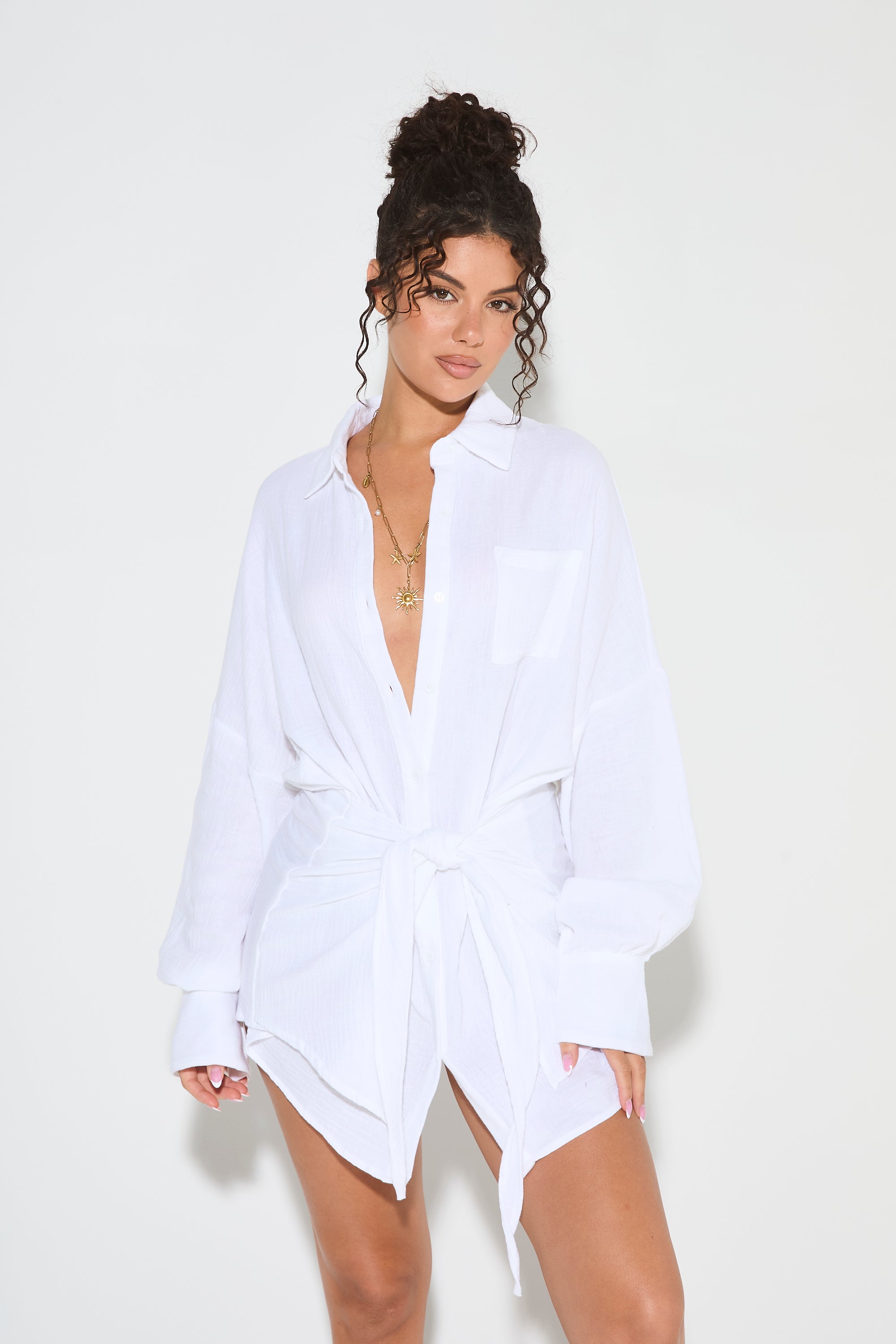 This GRETA White Cheesecloth Tie Front Dress is a wardrobe essential this summer. With the adjustable cinched waist and textured cheesecloth fabric, it's perfect to wear over a bikini or dress up with heels for the perfect holiday look.