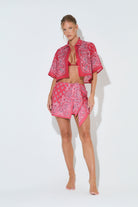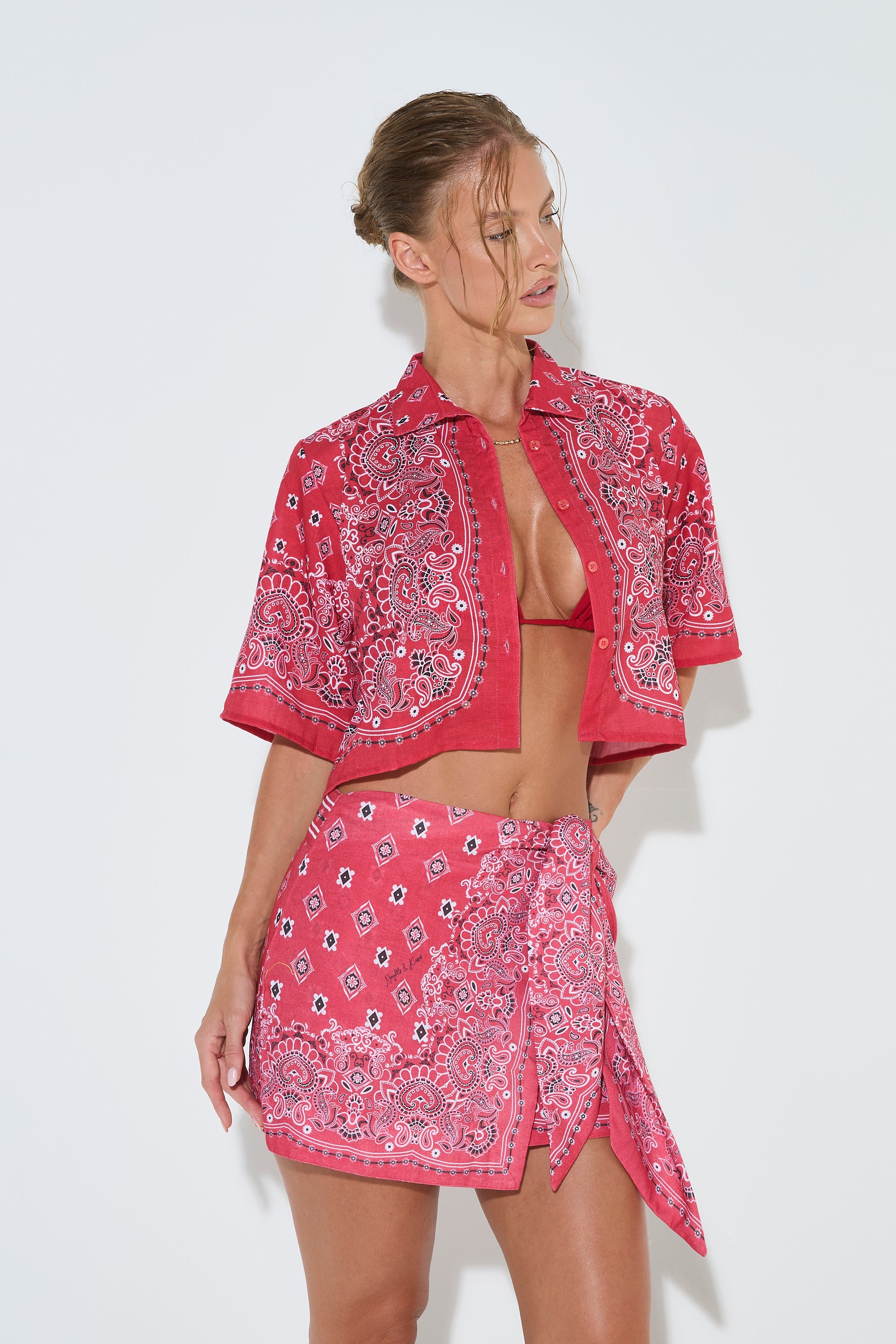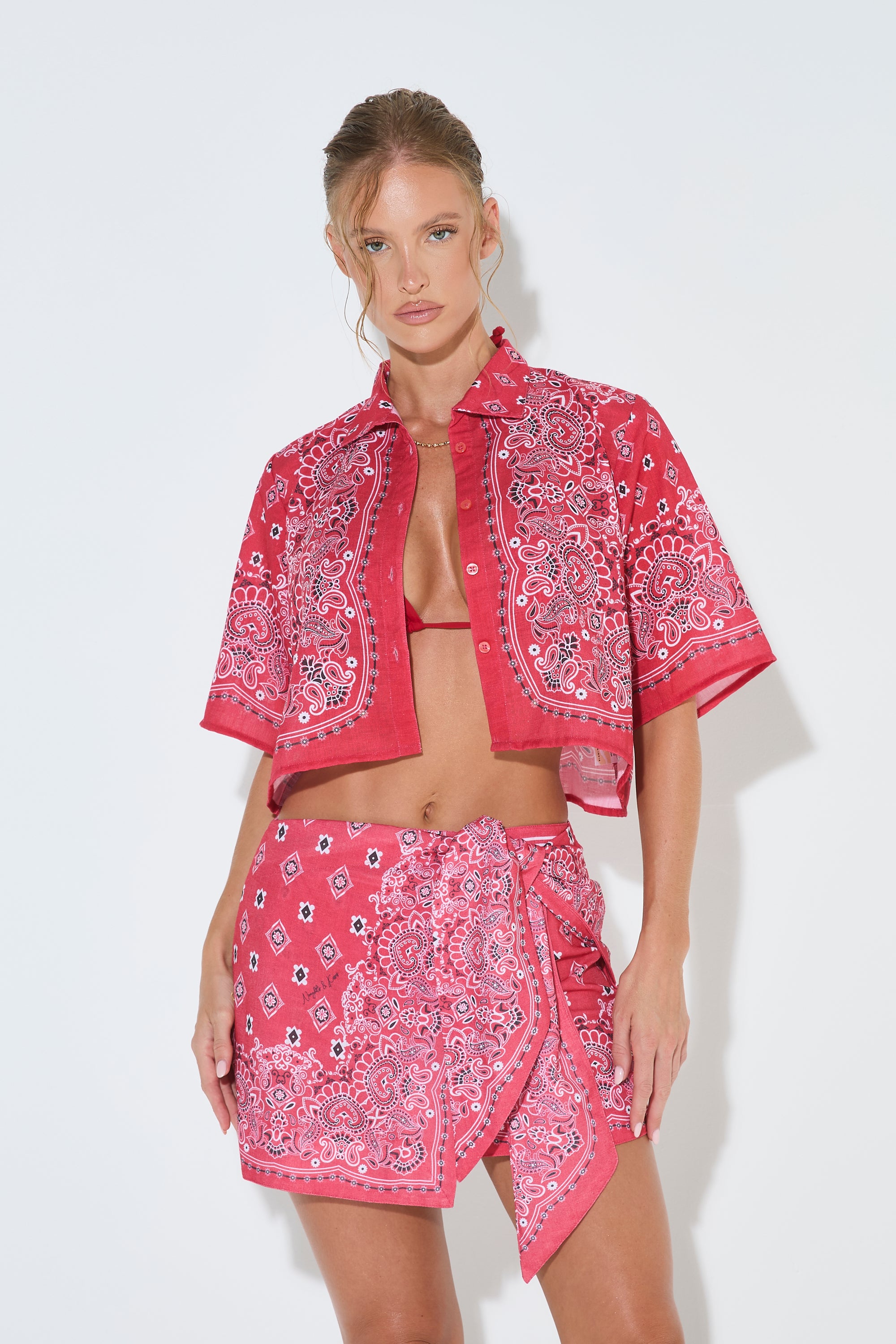 Styled with our BANDANA PRINT Red Cropped Shirt