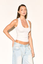 Experience luxury comfort in our TIA White Knit Tank Top. Made with a premium knit fabric, this tank top features a flattering scooped neckline.