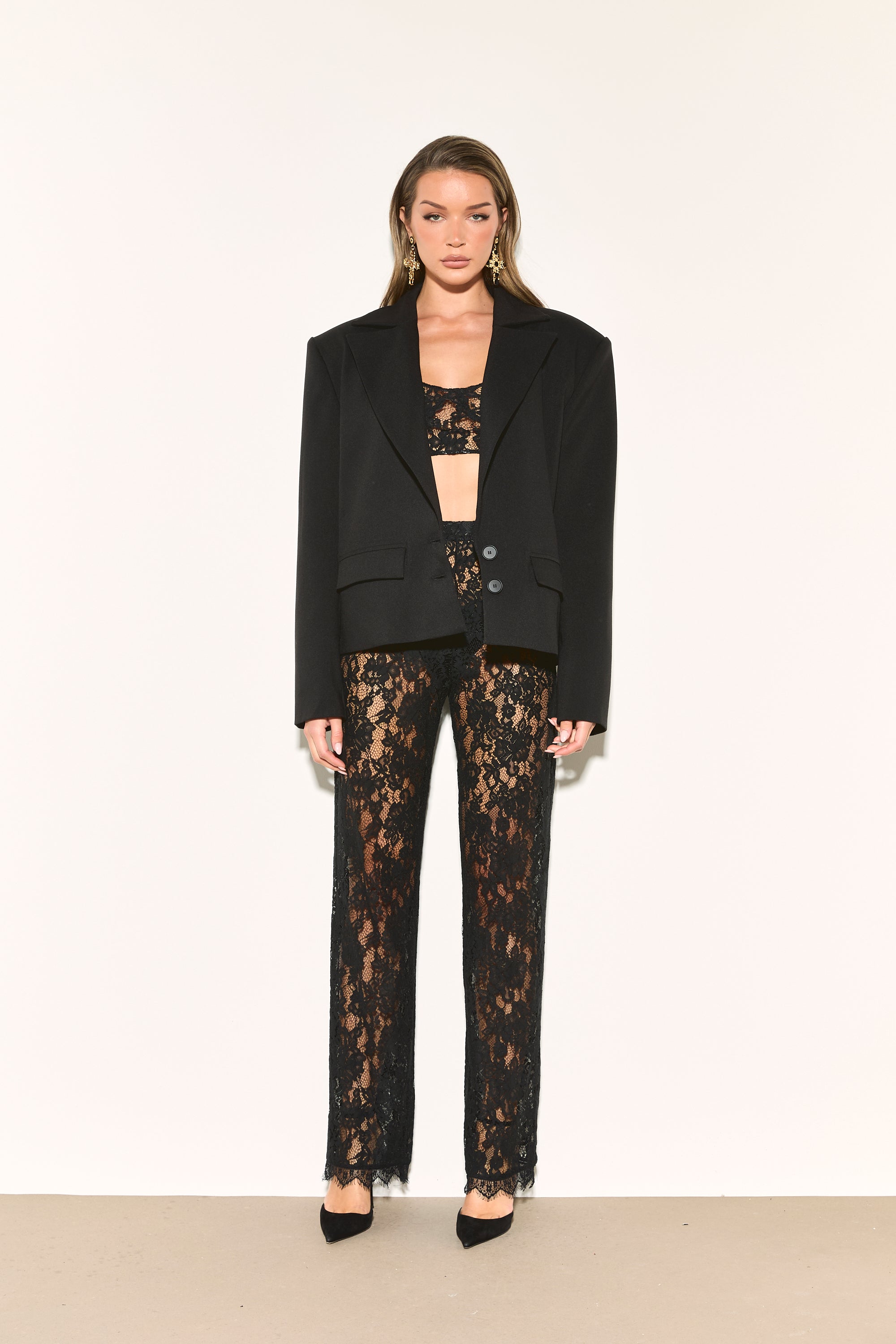 Elevate your style with the DANA Black High Waist Lace Trouser. Crafted from intricate lace, these trousers hug your waist while adding a touch of elegance to every step. Perfect for those who love blending daring fashion with soft, graceful details.
