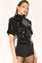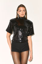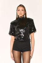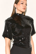 Introducing our ADA Black Sequin Shoulder Pad T-Shirt, the perfect statement piece for your next party season look! With its eye-catching sequin design and elevated shoulder pads, this t-shirt will dress up any outfit.