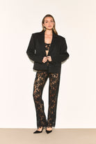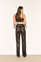 Elevate your style with the DANA Black High Waist Lace Trouser. Crafted from intricate lace, these trousers hug your waist while adding a touch of elegance to every step. Perfect for those who love blending daring fashion with soft, graceful details.