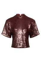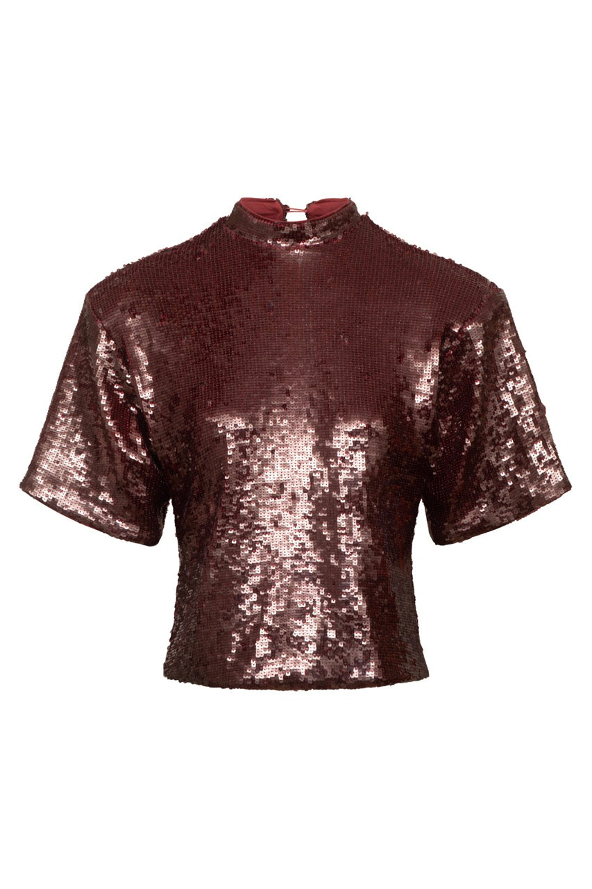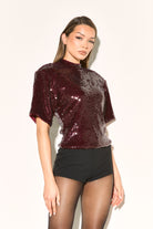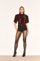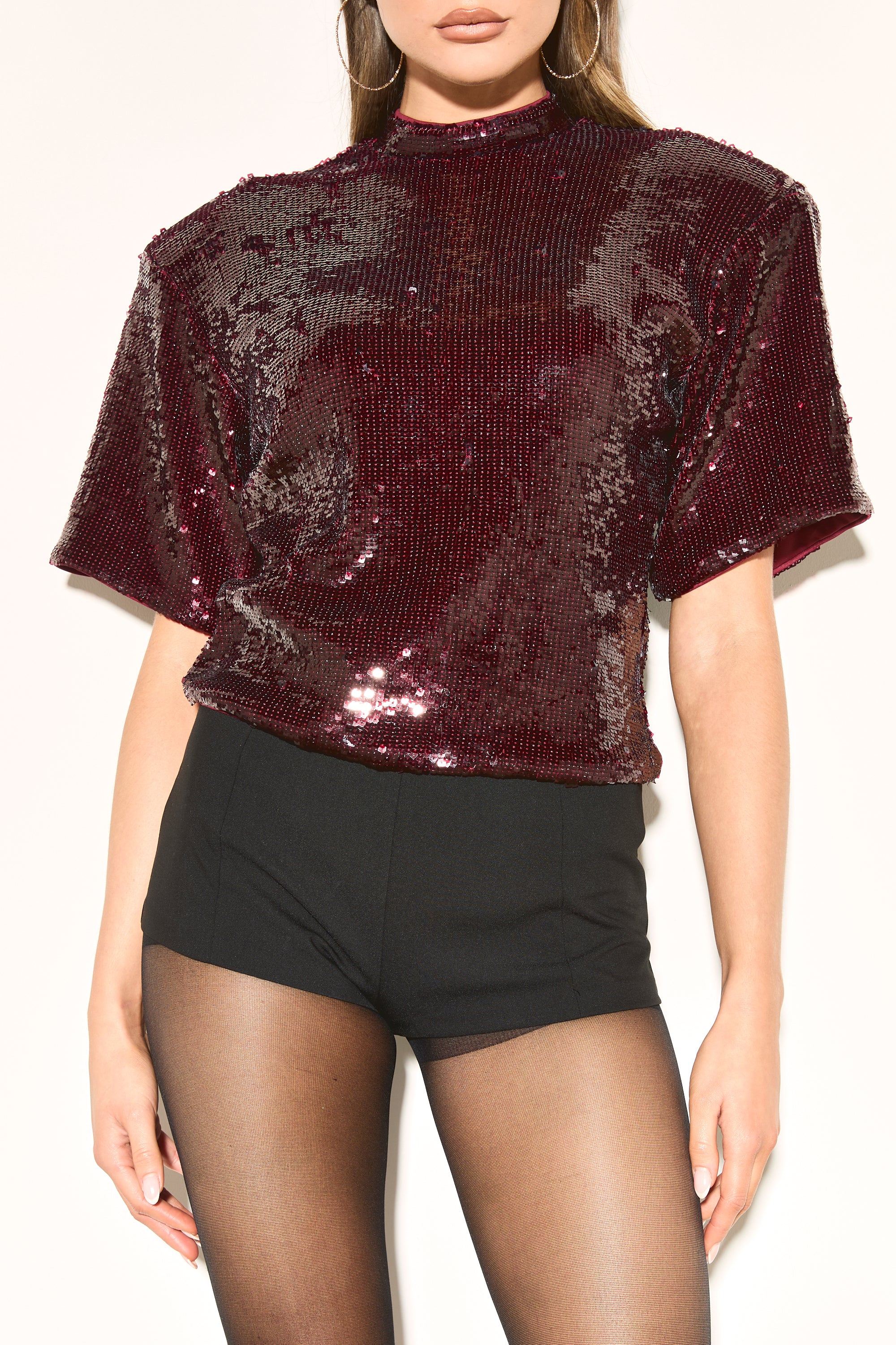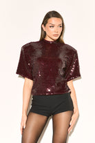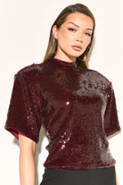 Introducing our ADA Burgundy Sequin Shoulder Pad T-Shirt, the perfect statement piece for your next party season look! With its eye-catching sequin design and elevated shoulder pads, this t-shirt will dress up any outfit.