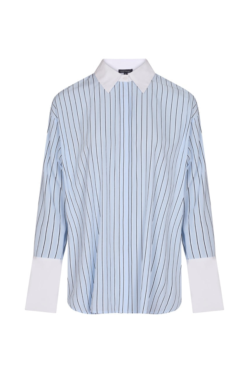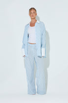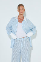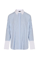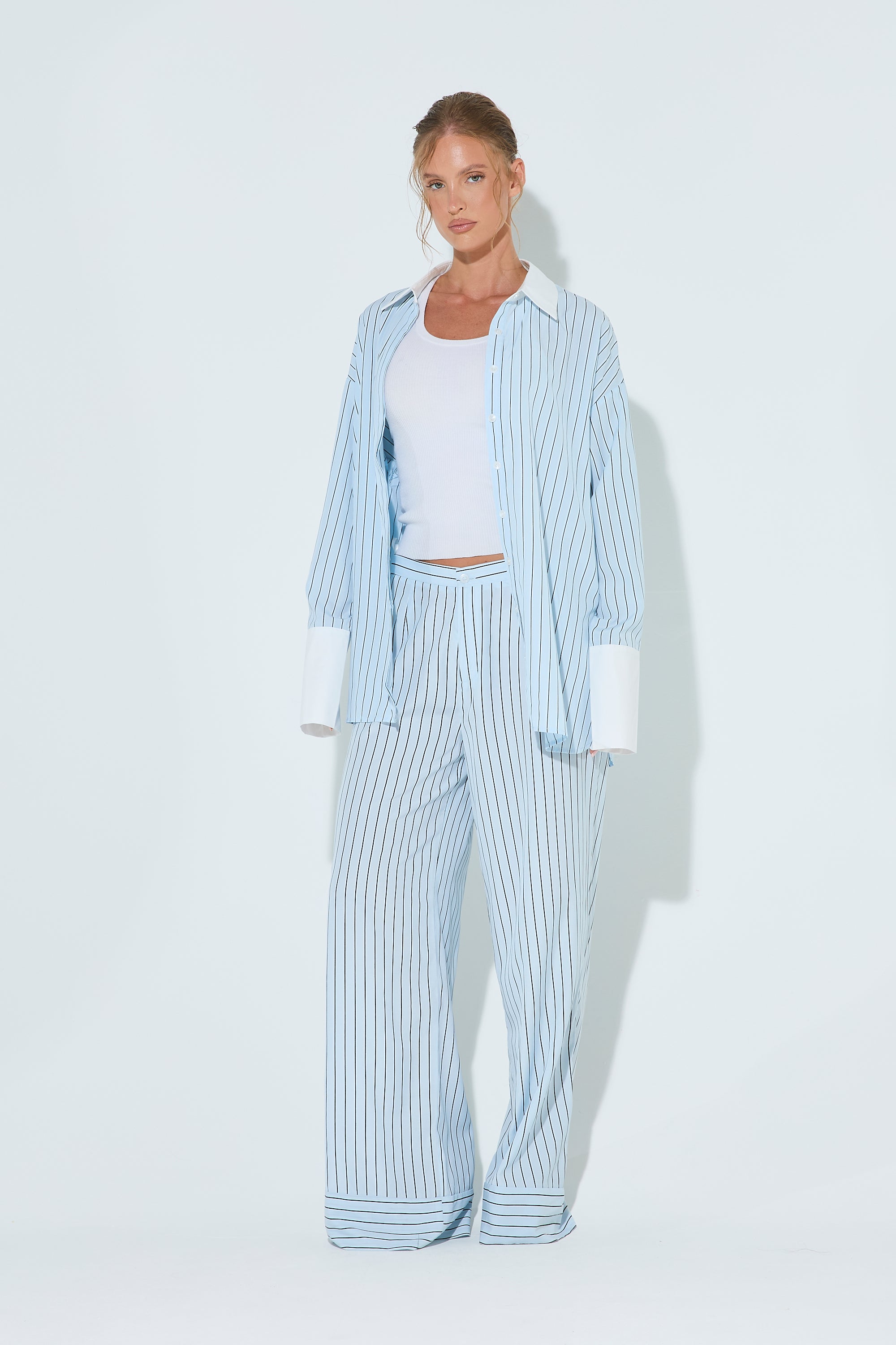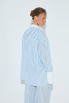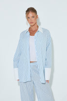 Upgrade your wardrobe with the ANA Blue Contrast Stripe Oversized Shirt. The oversized fit is perfect for a fashion-forward, cool girl look. Its versatility allows you to easily transition from day to night, making it a must-have addition to your wardrobe.