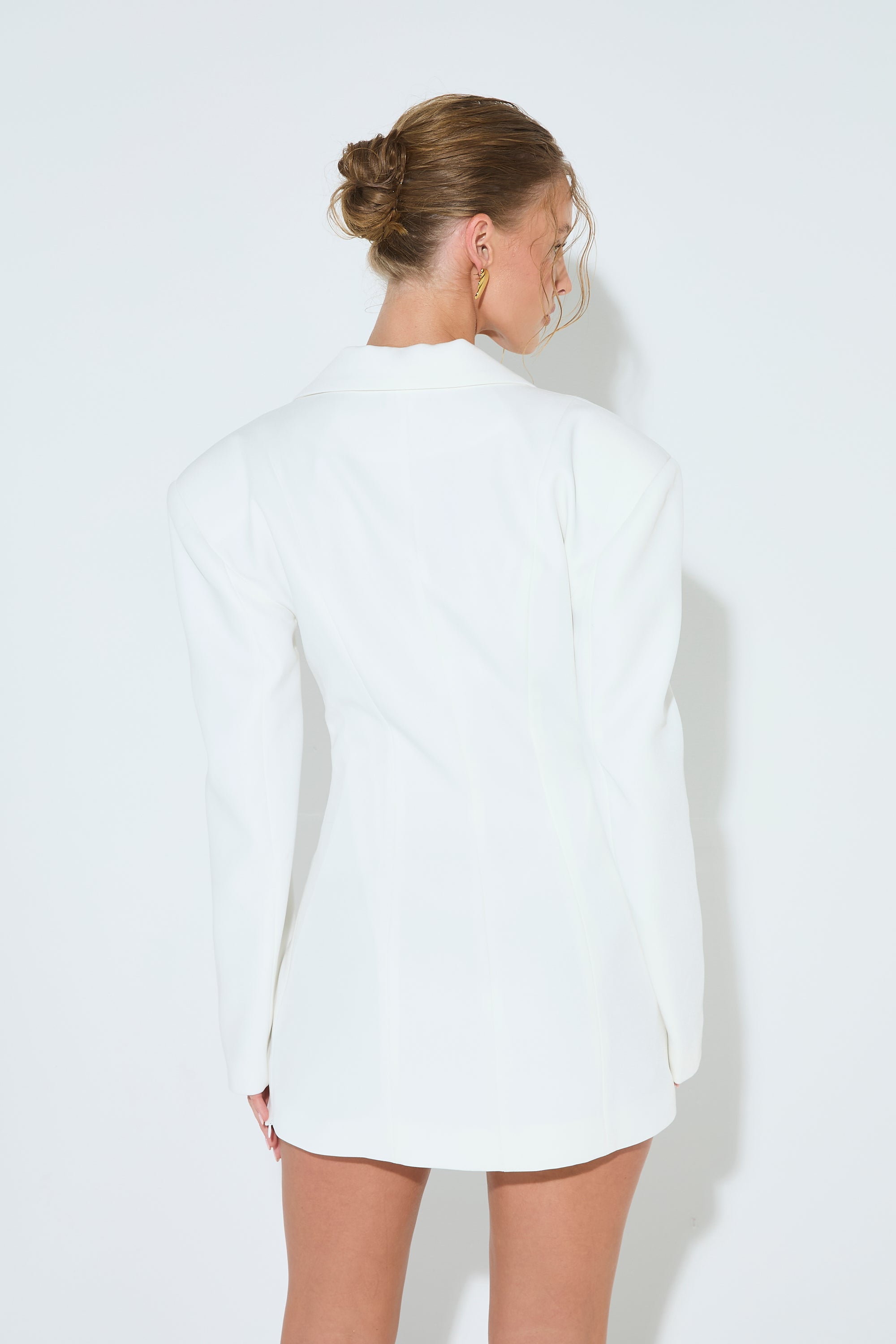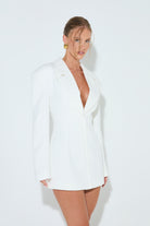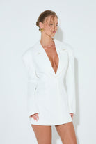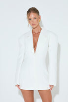 Designed for the confident and stylish woman, the FLAVIA Structured Blazer Dress features shoulder pads and a cinched waist for a flattering silhouette.