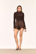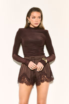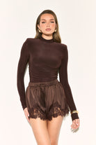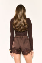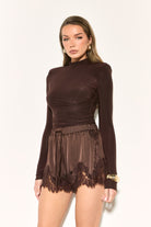 Re-introducing the LEOLA Brown Lace Shorts. Crafted from smooth black satin and delicate lace, these shorts blend comfort with flirty elegance. Perfect for dressing up, they hug your curves while keeping you cool and confident.