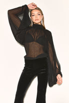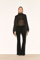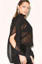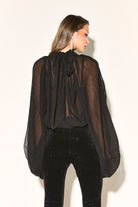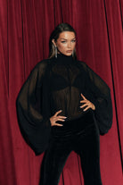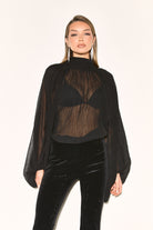 Effortlessly chic the NATALIA Black Chiffon Blouse features a flattering high neckline that adds a touch of sophistication. While the semi sheer fabric brings femininity to your look.