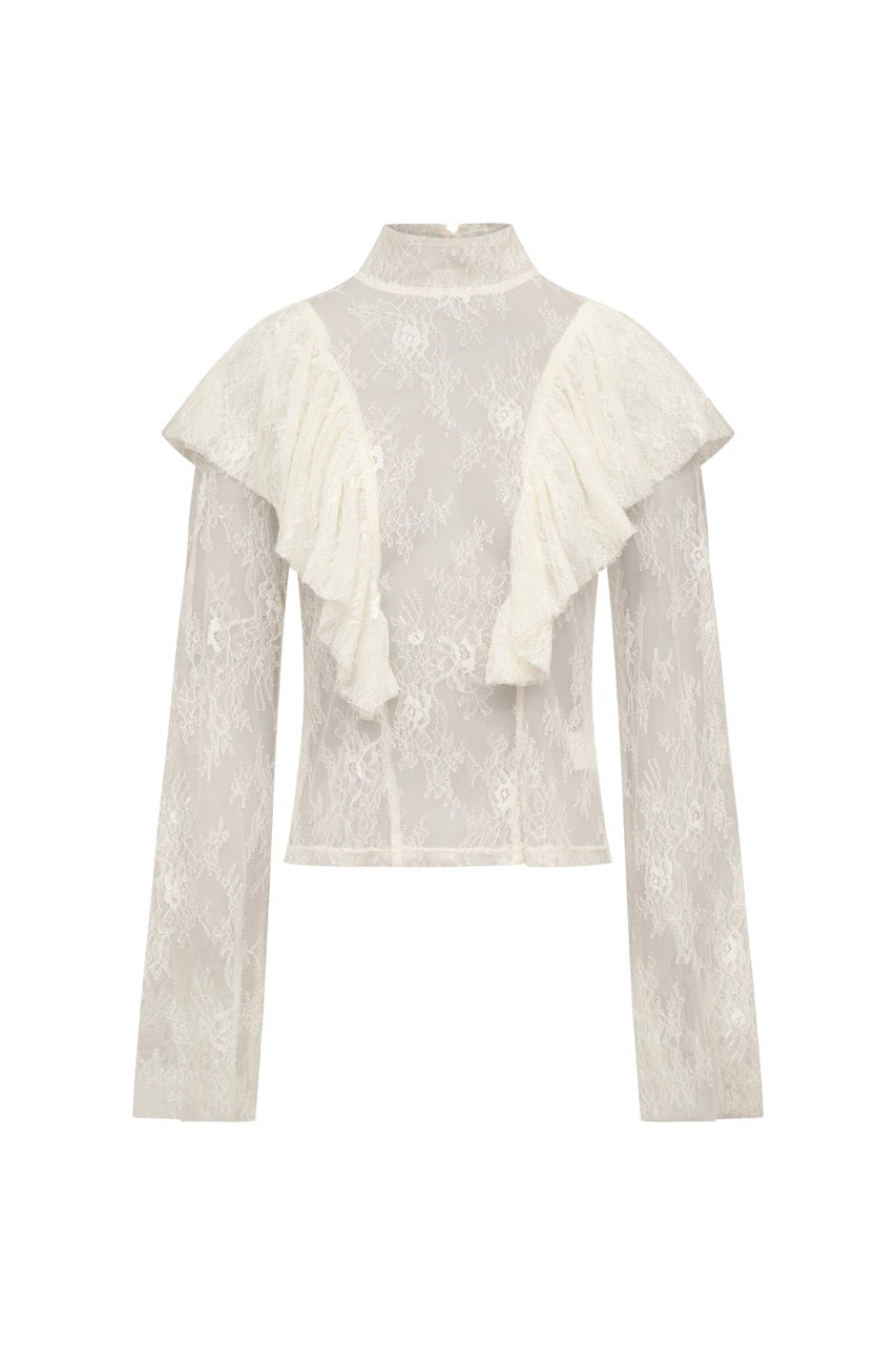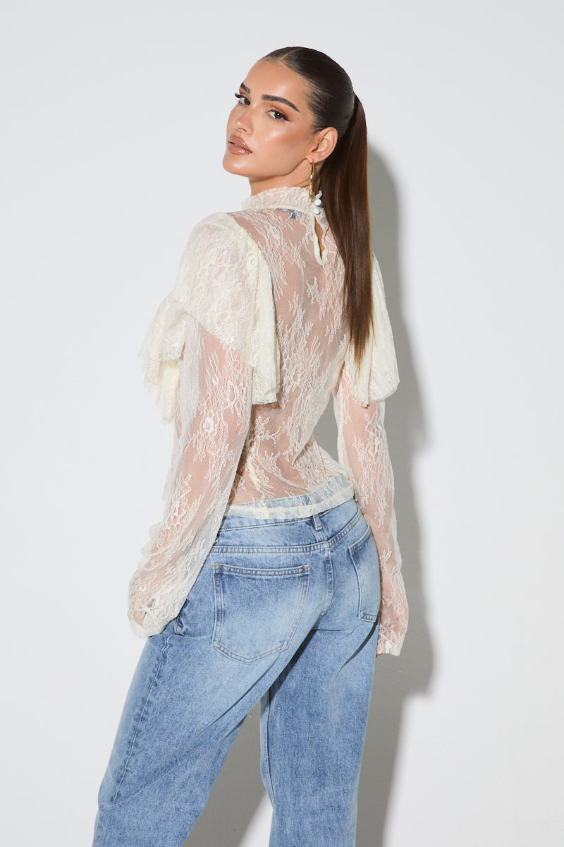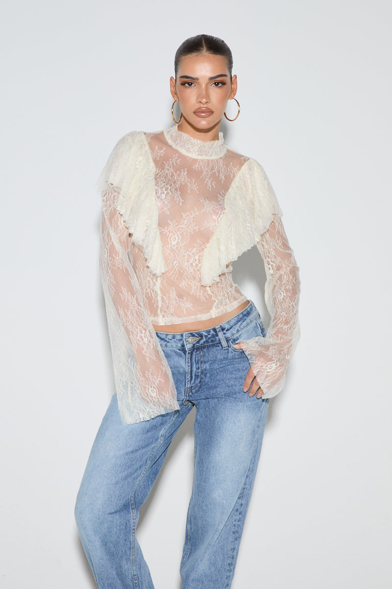 Experience timeless elegance with the PENELOPE Cream Lace Ruffle Blouse. The classic ruffle and delicate lace details add a touch of sophistication to any outfit, while staying on trend.