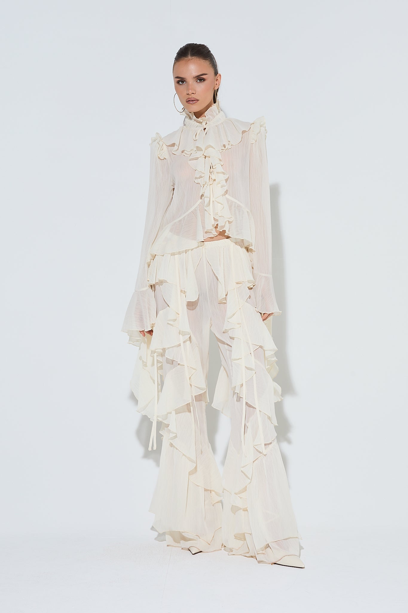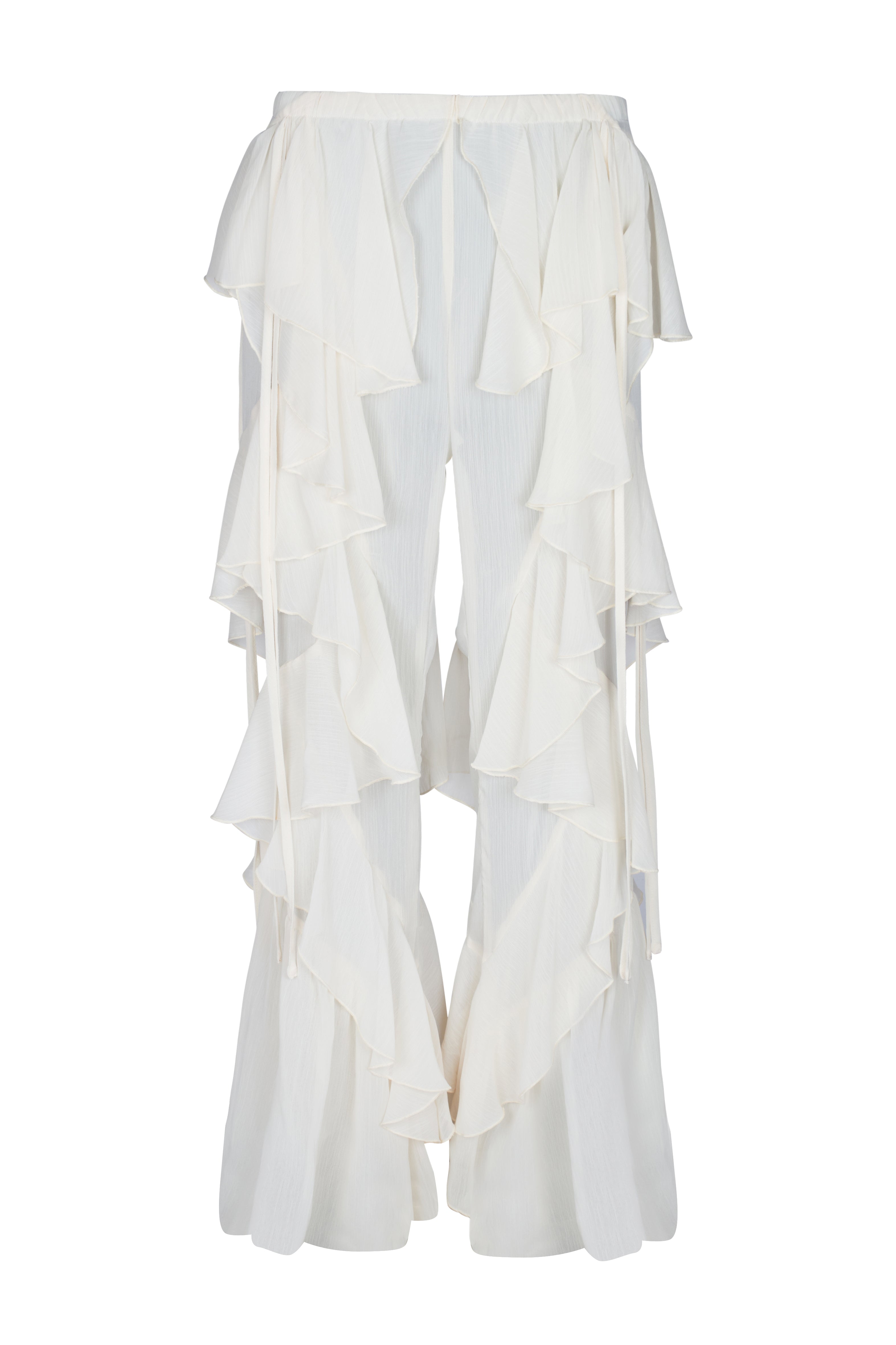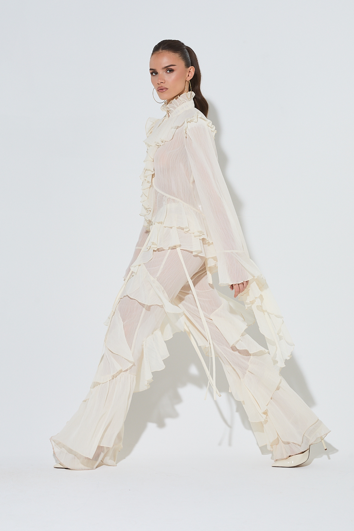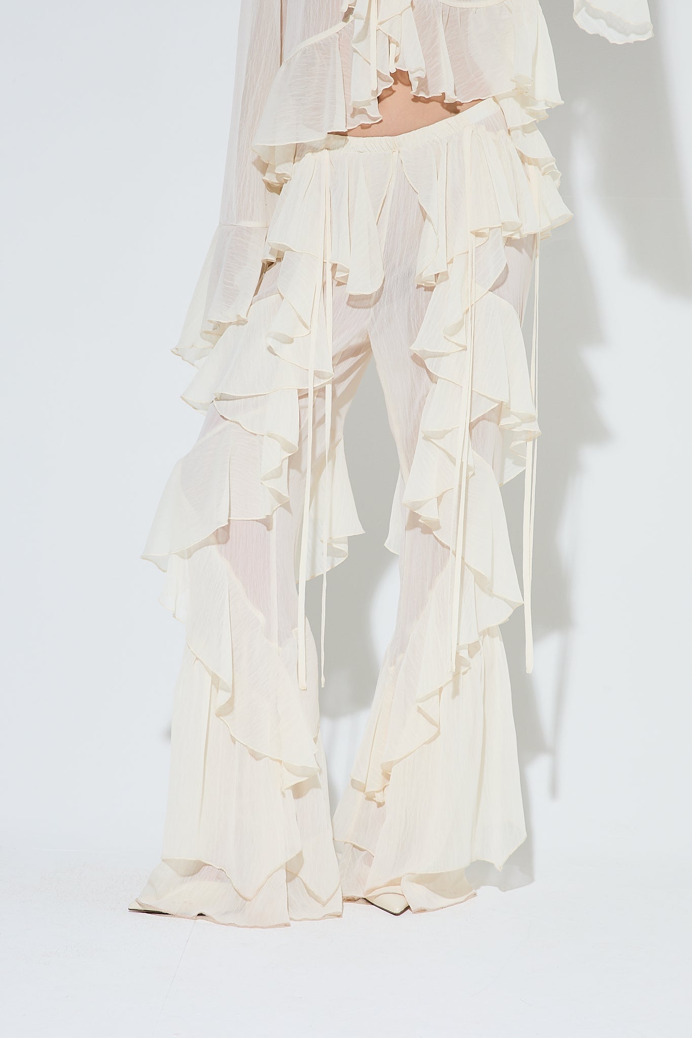 Introducing CELIA Cream Ruffle Flared Trousers - the perfect blend of boho and sophistication. Made of light chiffon fabric, the flattering ruffled design adds a touch of elegance to these trousers.