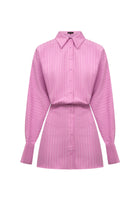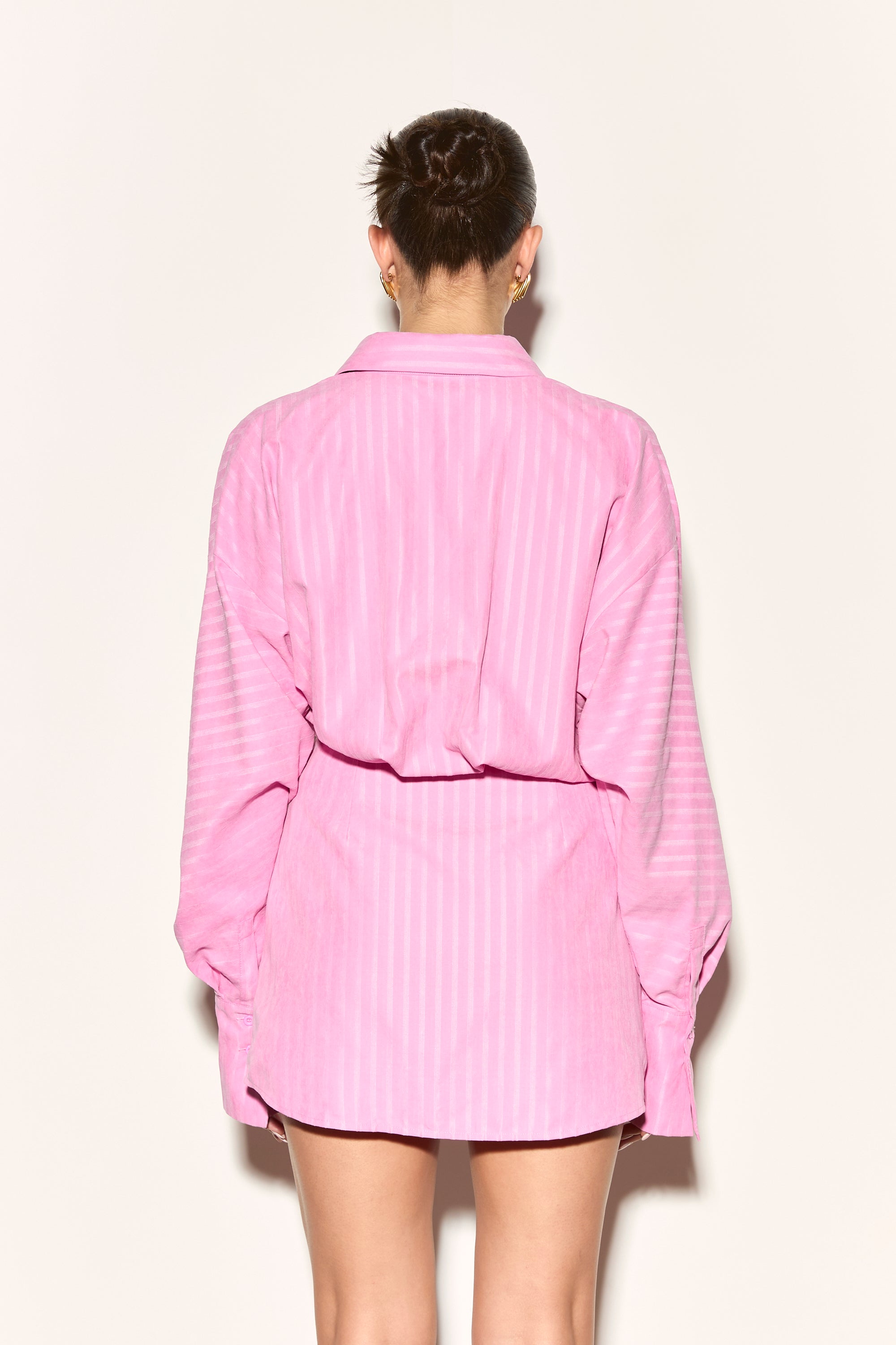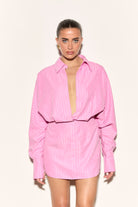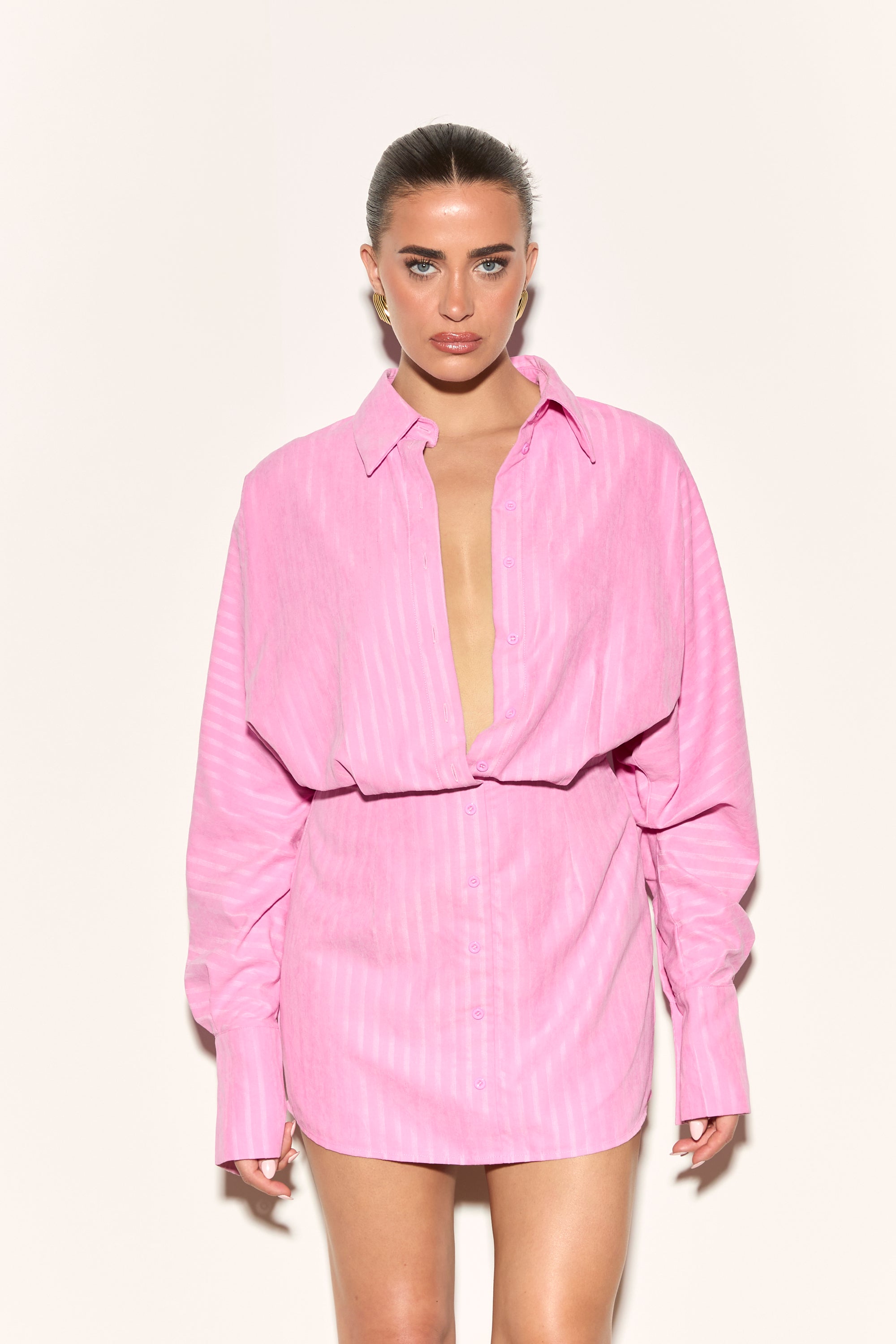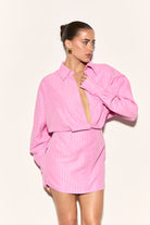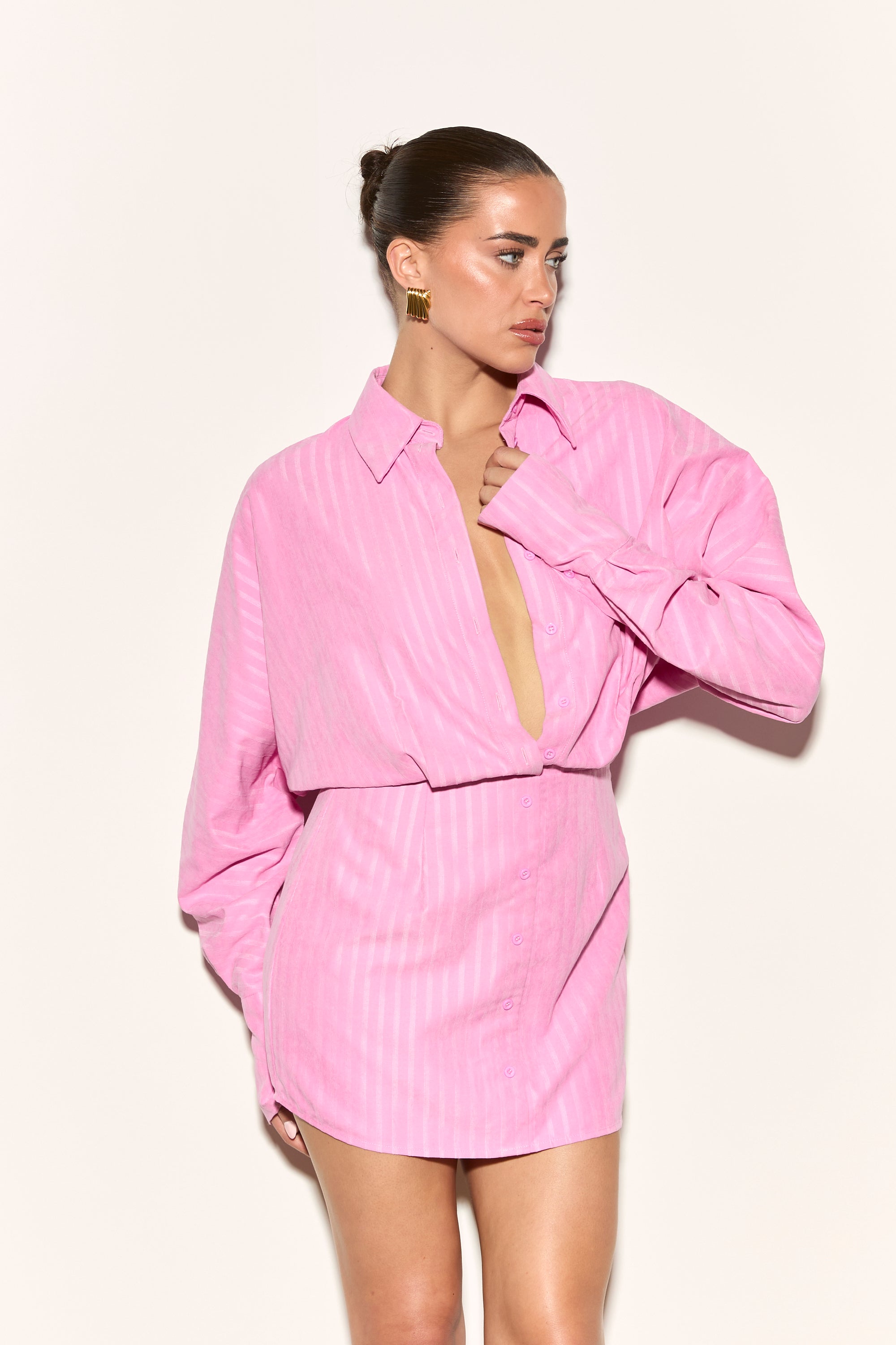 Effortlessly stylish and flattering, the LEONE Pink Stripe Shirt Dress is perfect for any occasion. Boasting a beautiful stripe pattern and dropped sleeves, this dress offers a timeless and chic look.