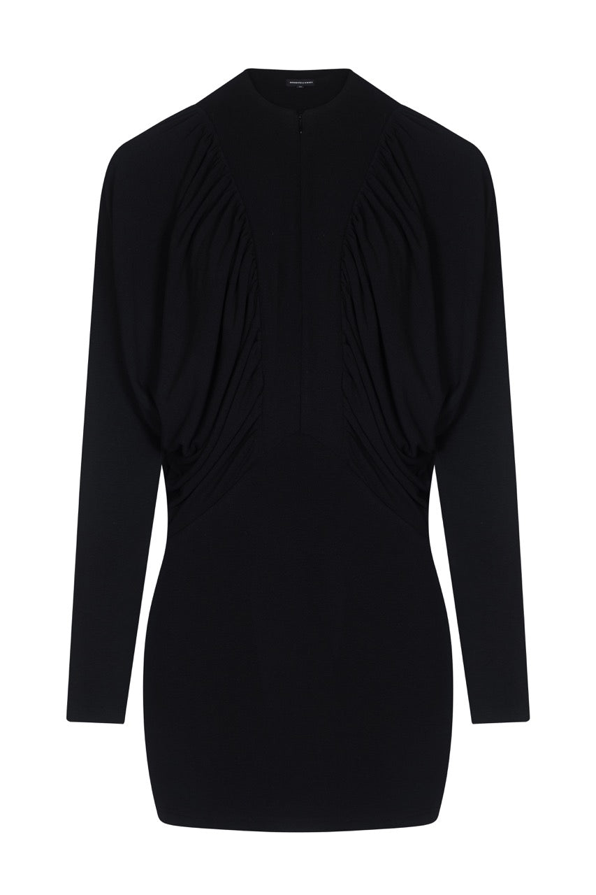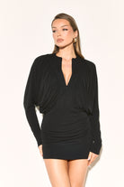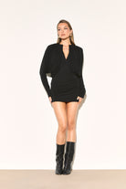 Step into the MARISA Black Draped Sleeve Zip Front Dress for a night of effortless style and comfort. Its stretchy fabric moves with you stay comfy and look fabulous all evening long!