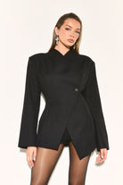 Turn heads with the NAIA Black Wrap Over Collarless Blazer. A sleek, figure-hugging classic that adds instant chic to any outfit. A timeless black blazer needed in every Autumn/Winter wardrobe.