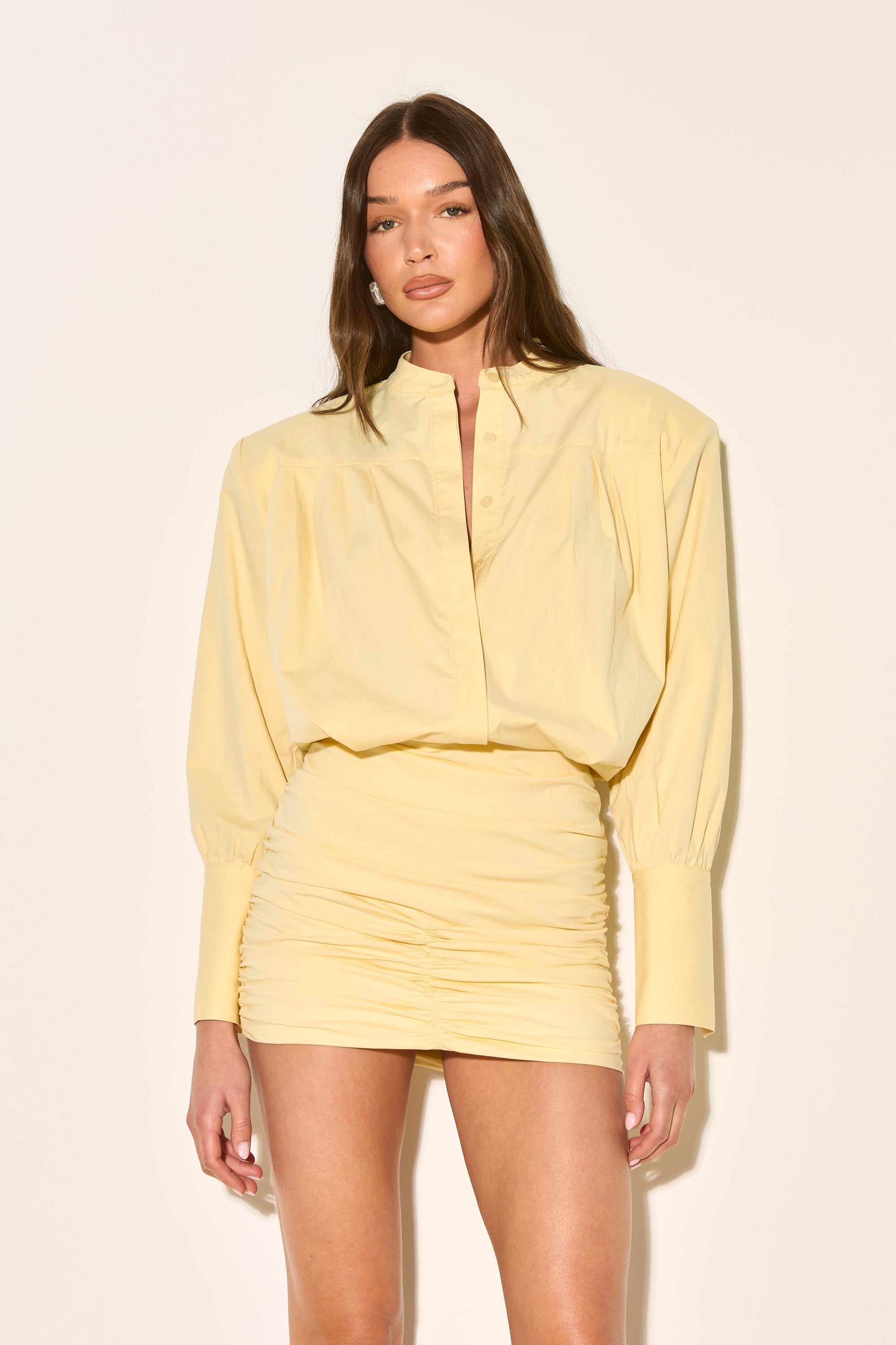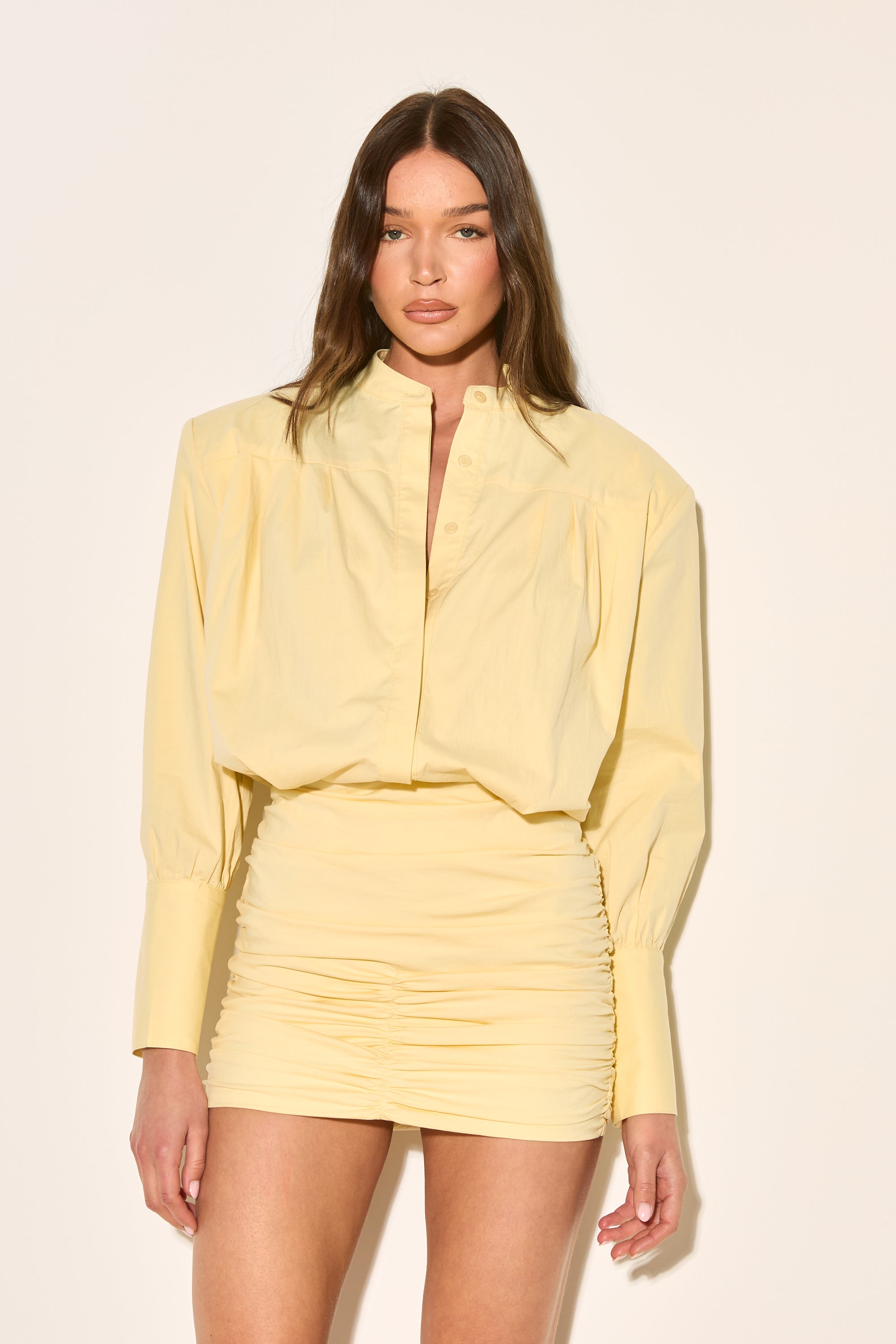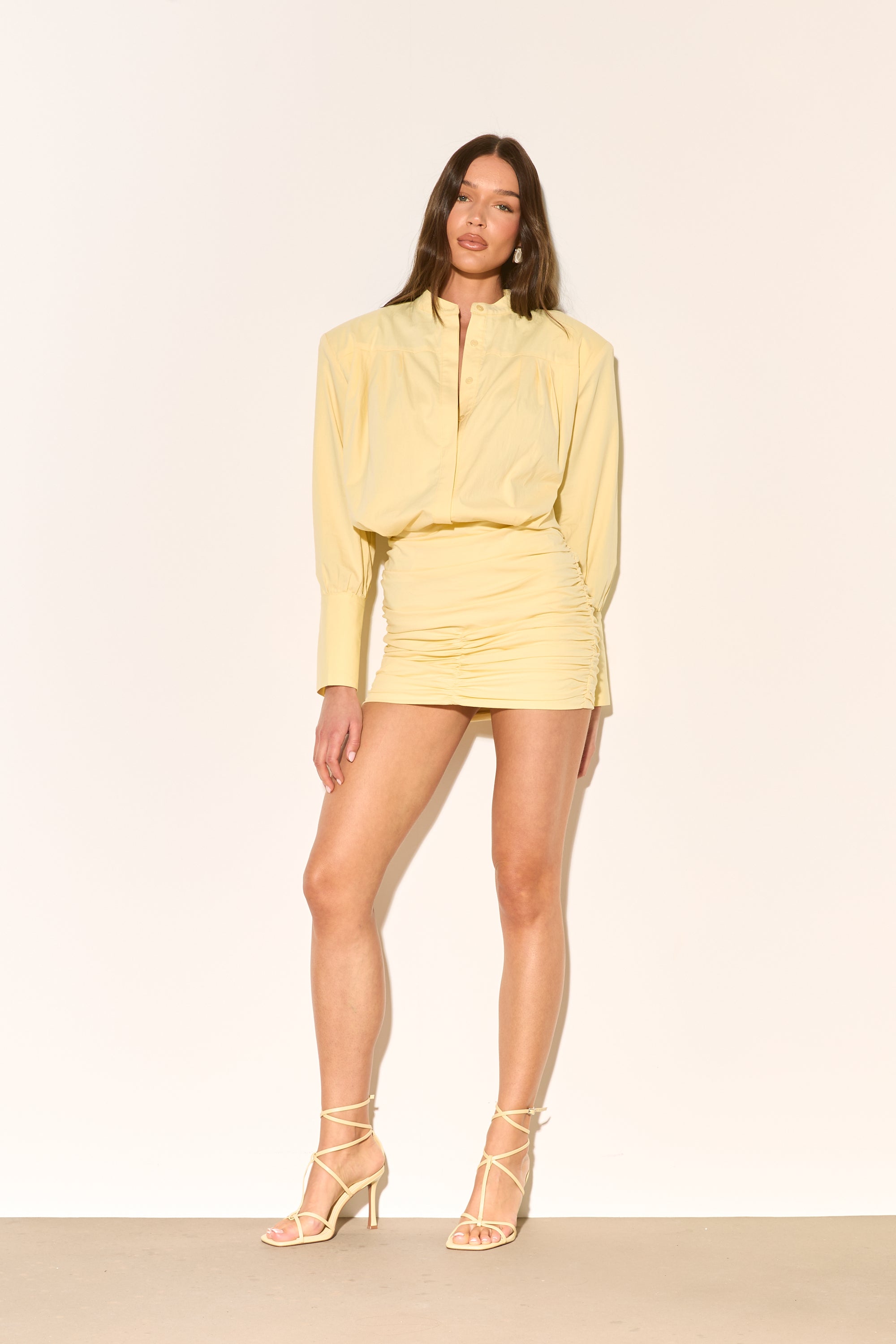 The TAMIA Lemon Shirt Dress combines effortless style with versatile wear. Featuring statement shoulder pads for a contemporary edge, this casual piece transitions seamlessly from day to night. The ruched skirt adds texture and movement, while the cinched waist creates definition.