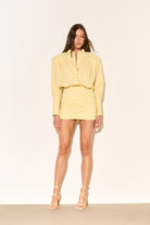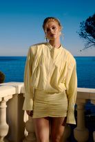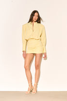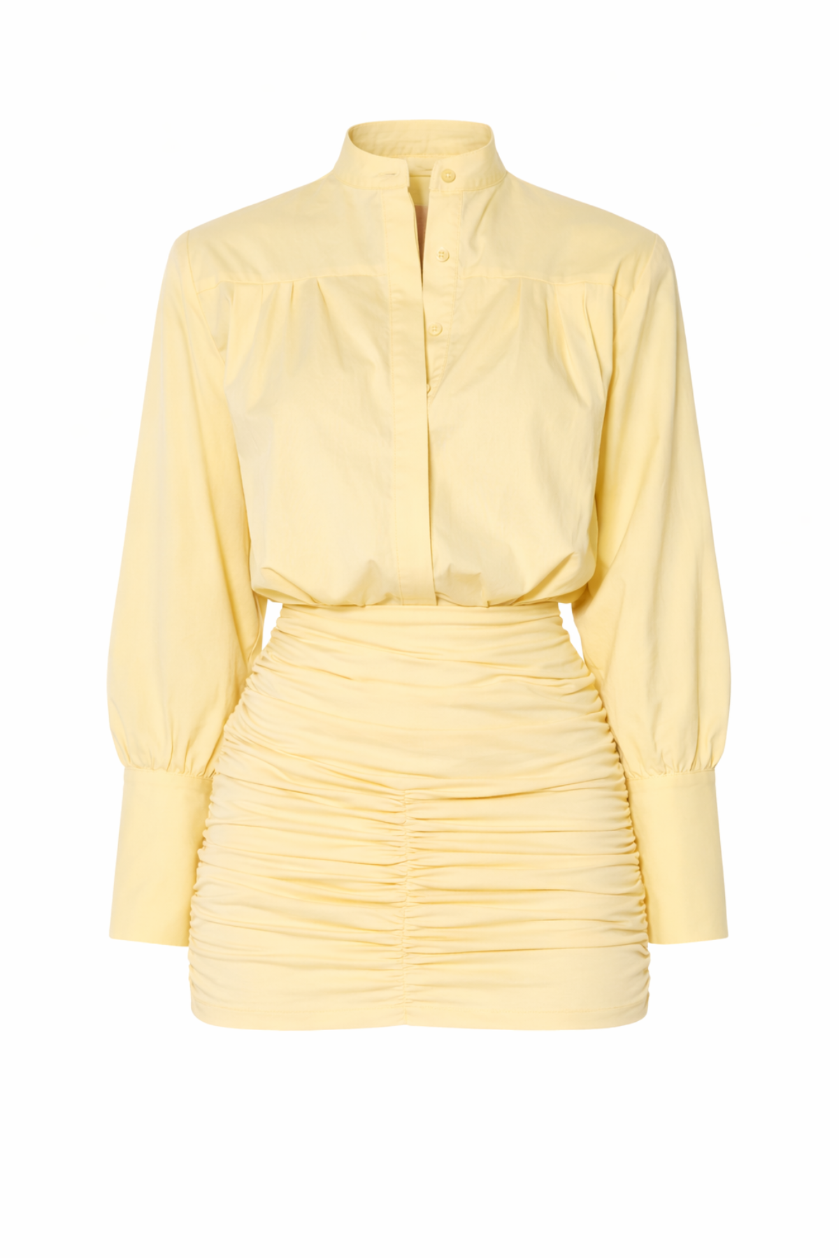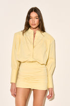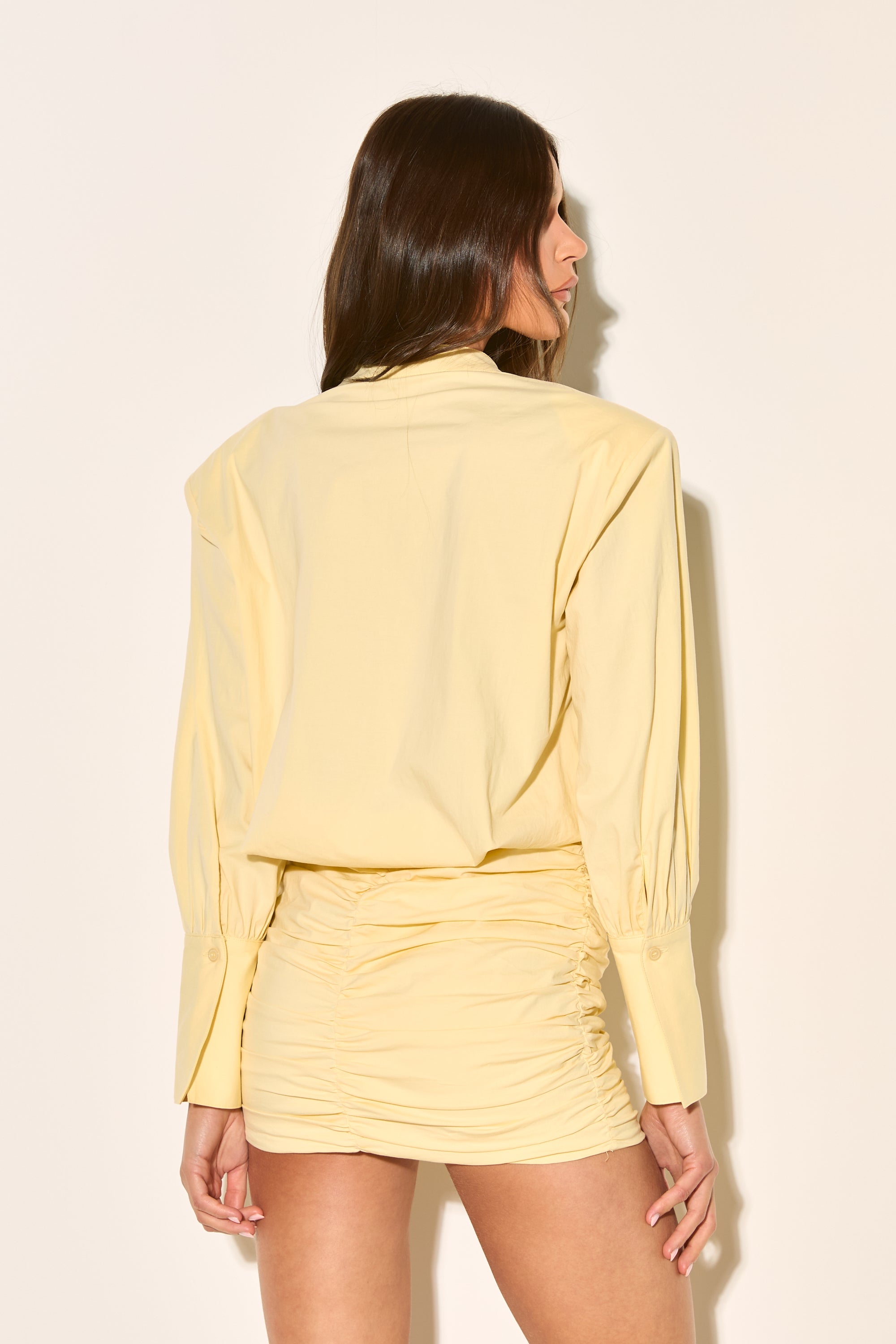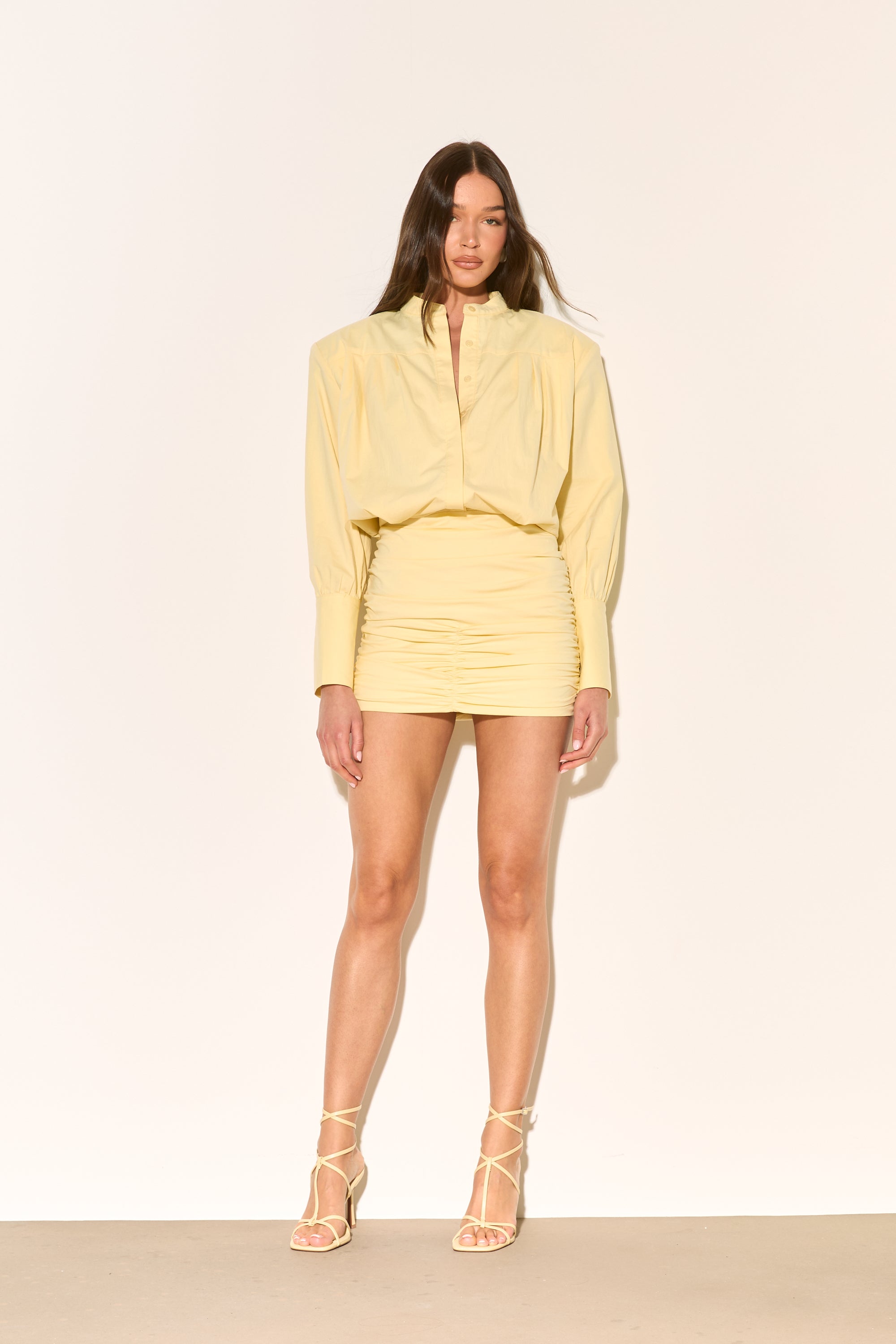 The TAMIA Lemon Shirt Dress combines effortless style with versatile wear. Featuring statement shoulder pads for a contemporary edge, this casual piece transitions seamlessly from day to night. The ruched skirt adds texture and movement, while the cinched waist creates definition.
