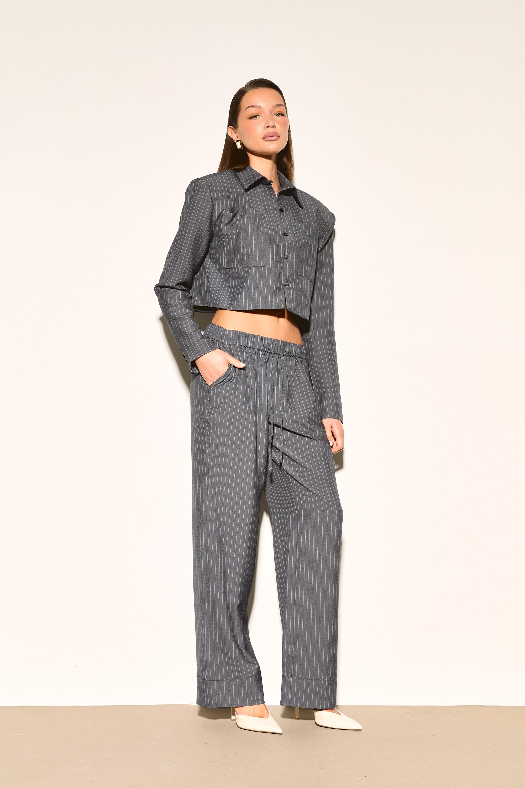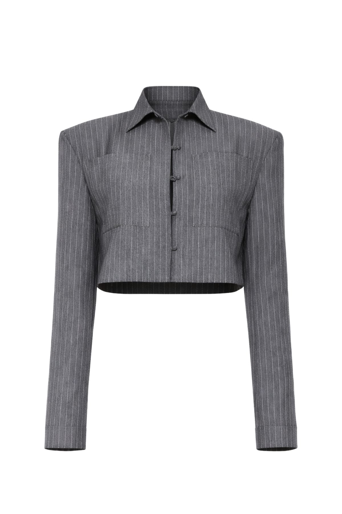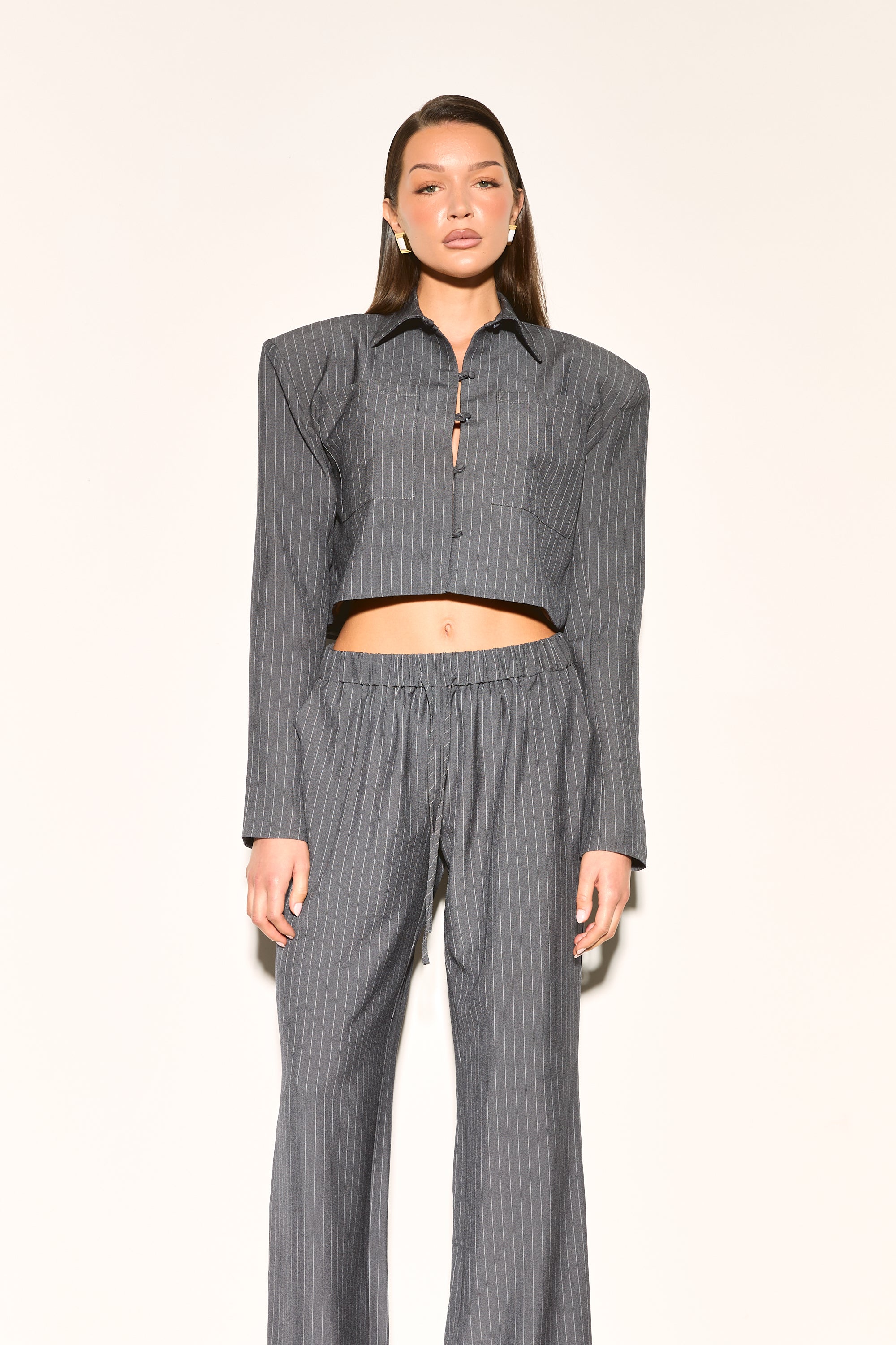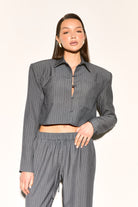 Sharp tailoring meets modern edge with our VELORA Grey Pinstripe Cropped Shirt. Structured shoulder pads deliver that confident, statement-making silhouette while the classic pinstripe pattern keeps things timelessly chic.
